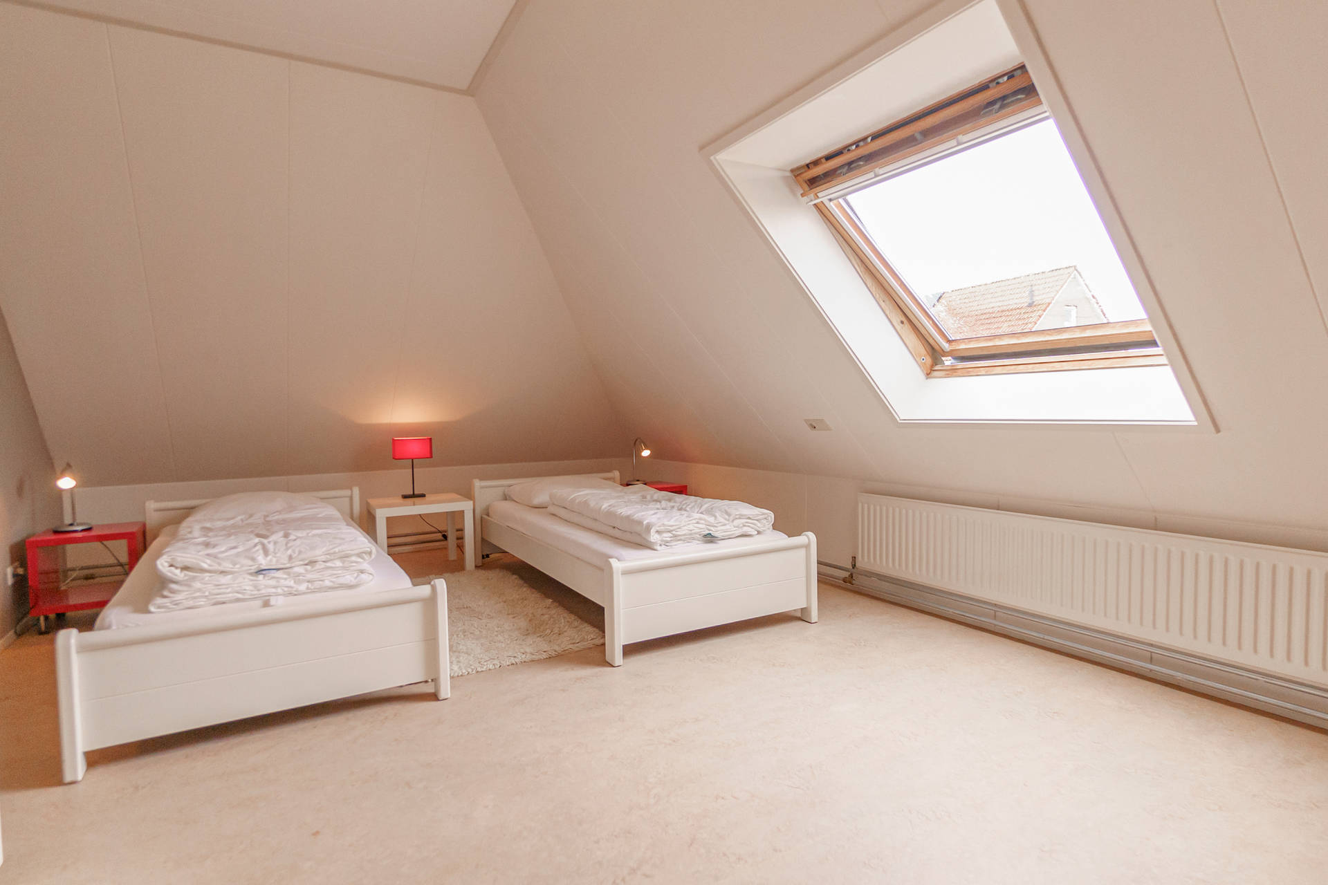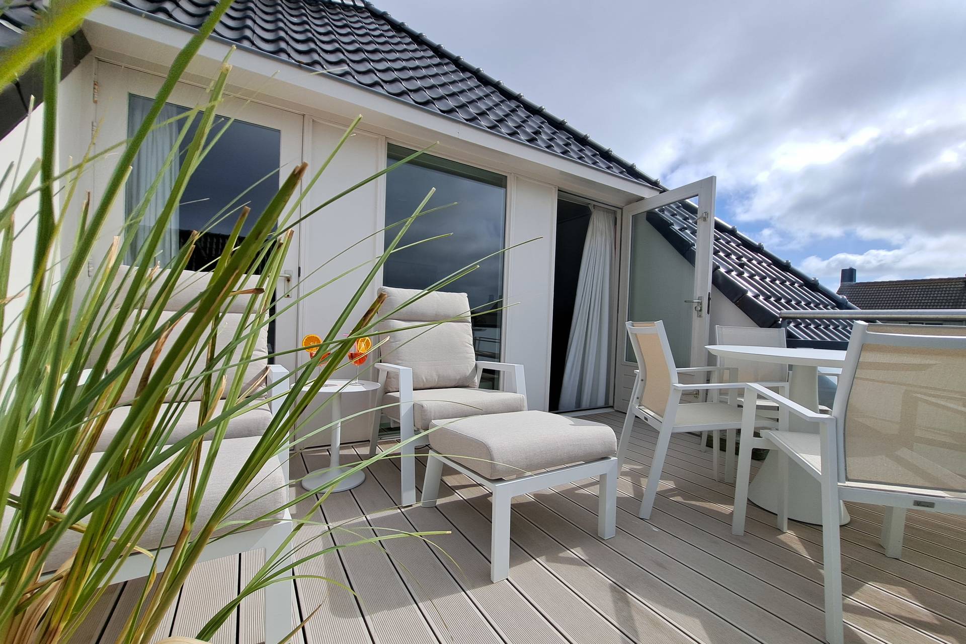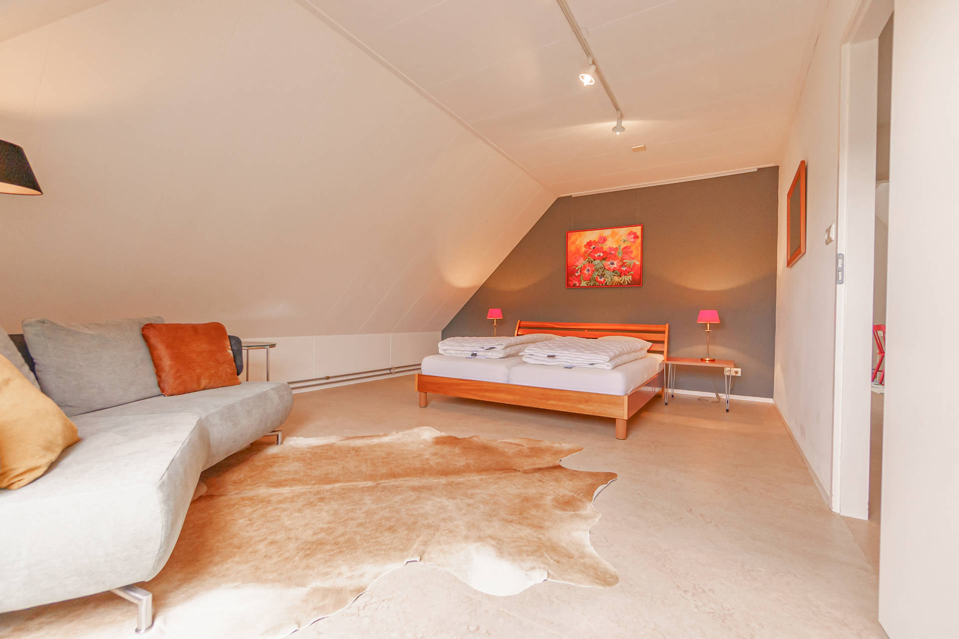 Sie betreten die Wohnung in der geräumigen Halle mit privater Treppe zu Ihrer Wohnung in den ersten Stock. Hier finden Sie im Nordosten 2 sehr geräumige Schlafzimmer für je 2 Personen. Mit Blick auf die Dünen in der Ferne befindet sich das Wohnzimmer mit offener Küche im Südwesten.