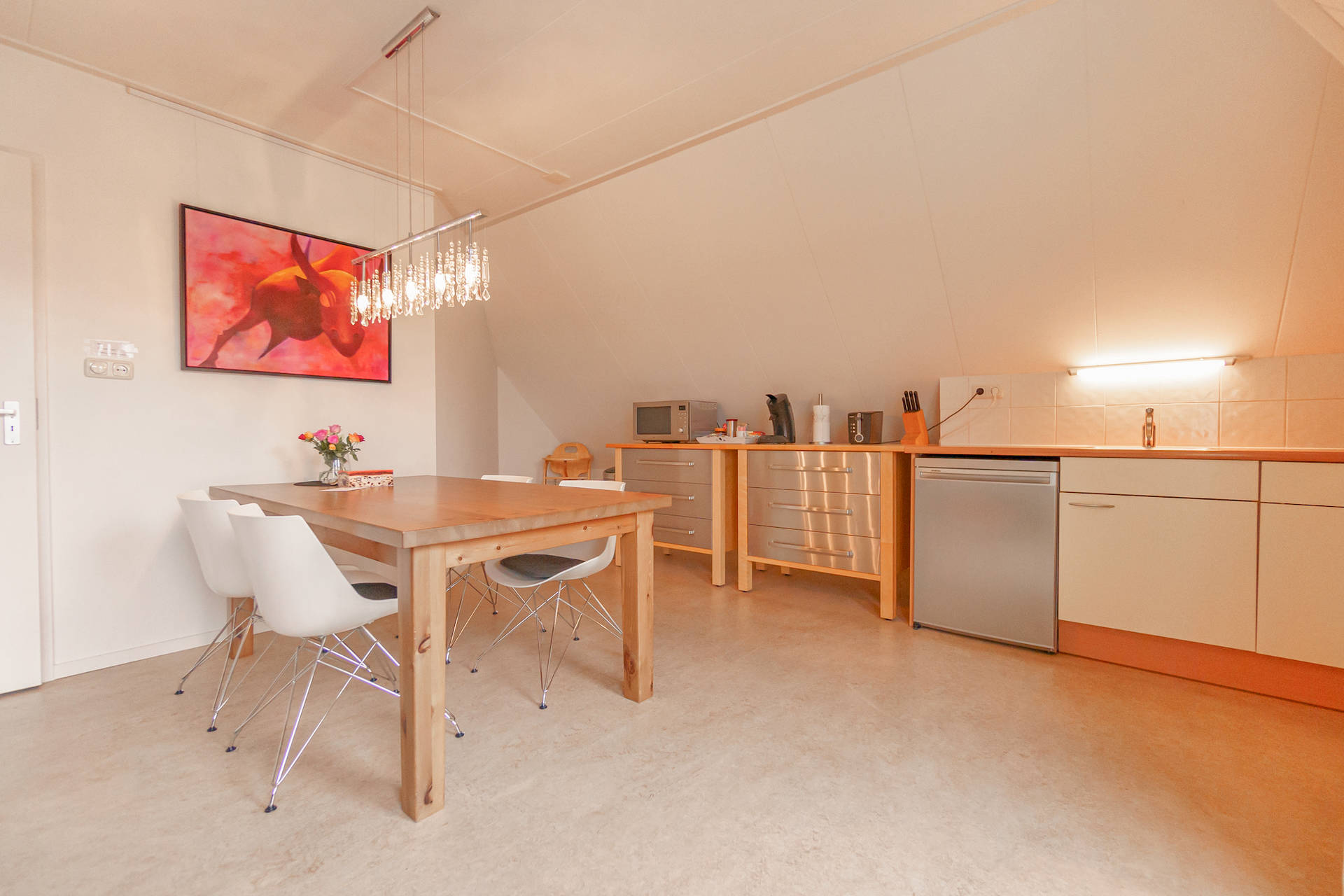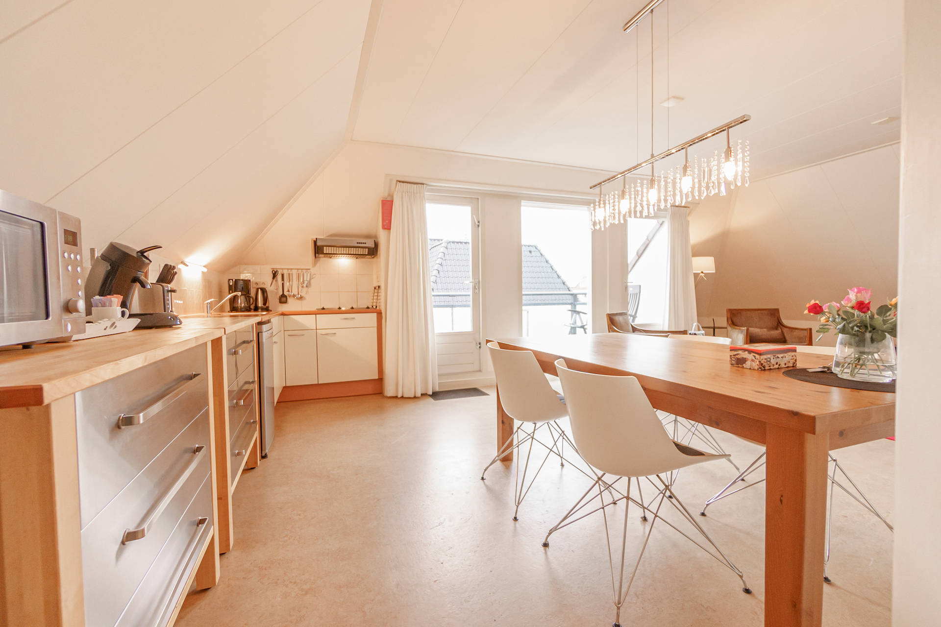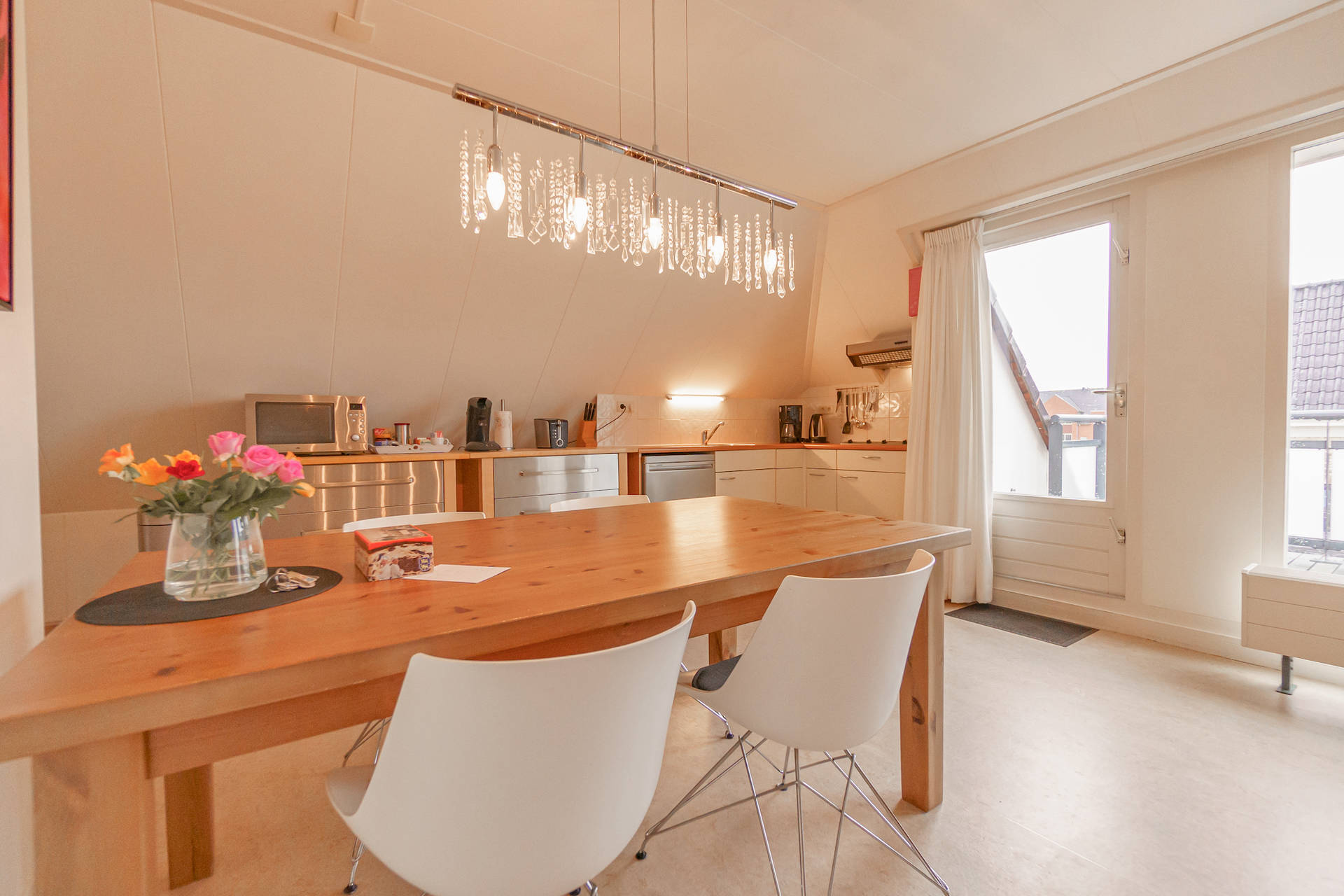 Im Wohnzimmer gibt es eine gemütliche Sitzecke mit Sofa und 2 Sesseln und einen guten Esstisch. Die offene Küche ist mit Kühlschrank, Kaffeemaschine, Senseo und Kombi-Ofen ausgestattet. Der ca. 10 m2 große Balkon nach Südwesten ist vom Wohnzimmer aus zugänglich.