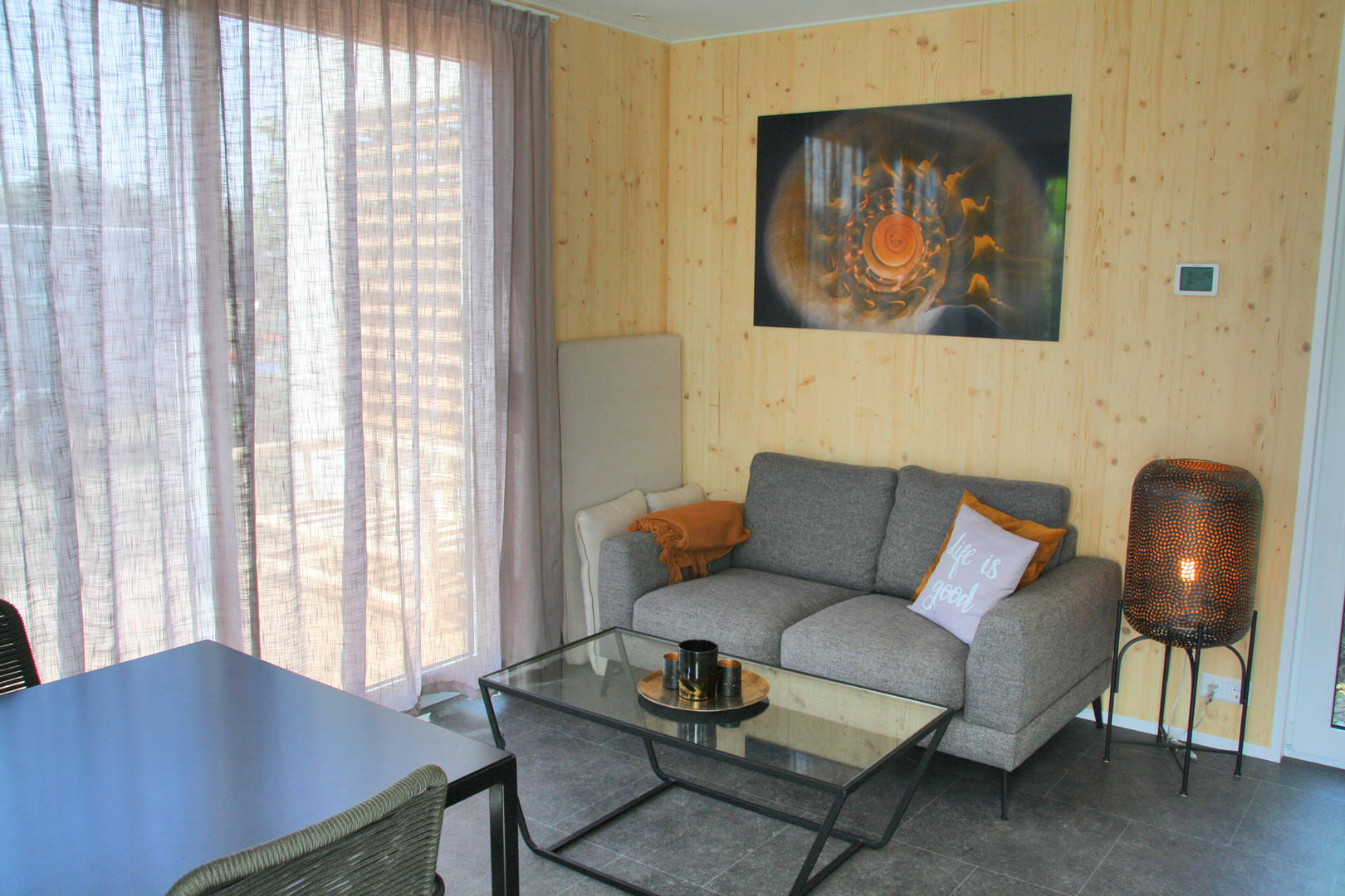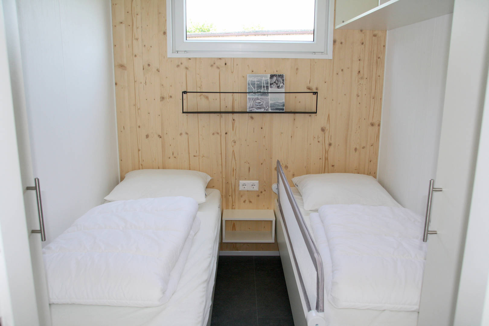 Das Haus befindet sich auf einer Ebene. Im Erdgeschoss befindet sich ein geschmackvoll eingerichtetes Wohnzimmer mit einer semi-offenenen Küche und eine Essecke. Vom Wohnzimmer aus gelangt man durch Schiebetüren auf die in Richtung Süden ausgerichtete Sonnenterrasse. Es gibt ein Schlafzimmer mit einem Doppelbett und ein Schlafzimmer mit zwei Einzelbetten. Dusche und WC befinden sich im gleichen Raum.