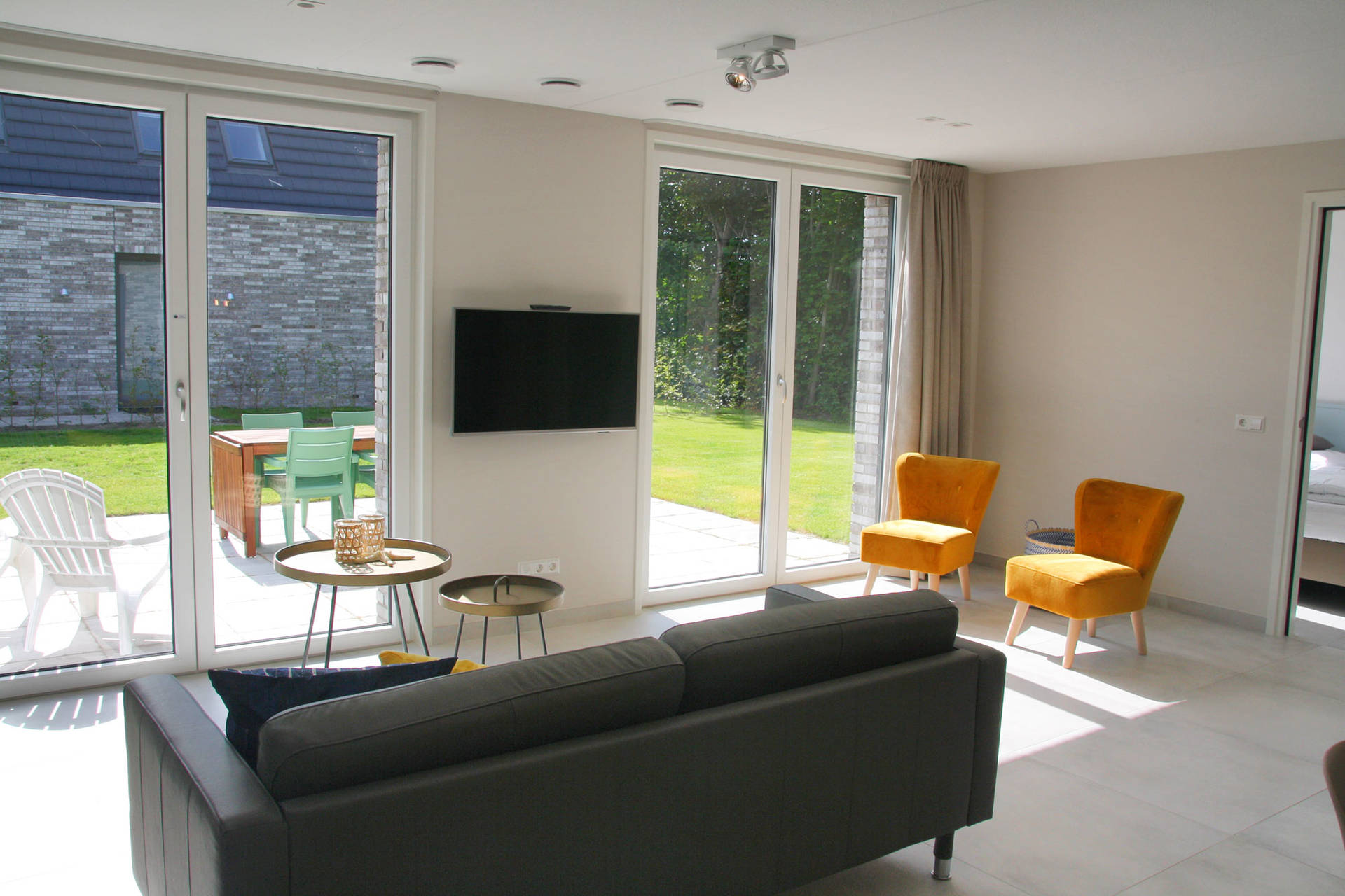 Das Haus hat eine Grundfläche von 90m2 im Erdgeschoss, was sehr angenehm ist, wenn man mit 8 Personen anreist. Das Haus ist geschmackvoll und modern eingerichtet. Im Erdgeschoss befindet sich das Wohnzimmer mit offener Küche und 1 Doppelschlafzimmer mit begehbarer Badezimmer en Suite. Im Wohnzimmer befindet sich ein großer ovaler Tisch, an dem man frühstücken, zu Mittag oder zu Abend essen oder mit der Familie Gesellschaftsspiele spielen kann. Außerdem gibt es einen schönen Sitzbereich zum Entspannen. Die Küche ist mit einem Kühlschrank, einem Gefrierschrank, einem Kombi-Ofen und einem Induktionskochfeld ausgestattet. Durch die Flügeltüren betreten Sie den großen Garten mit einem großen Tisch.