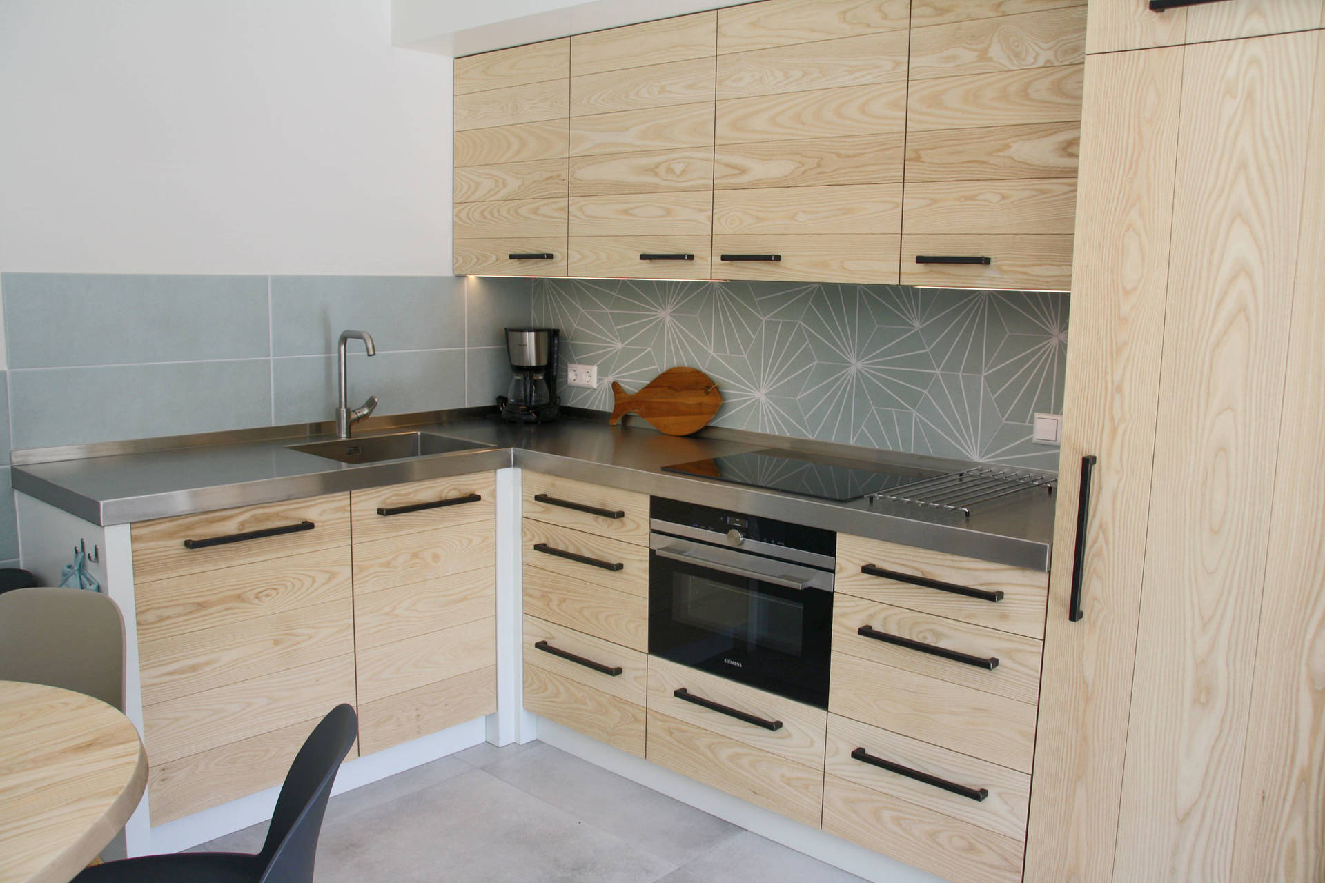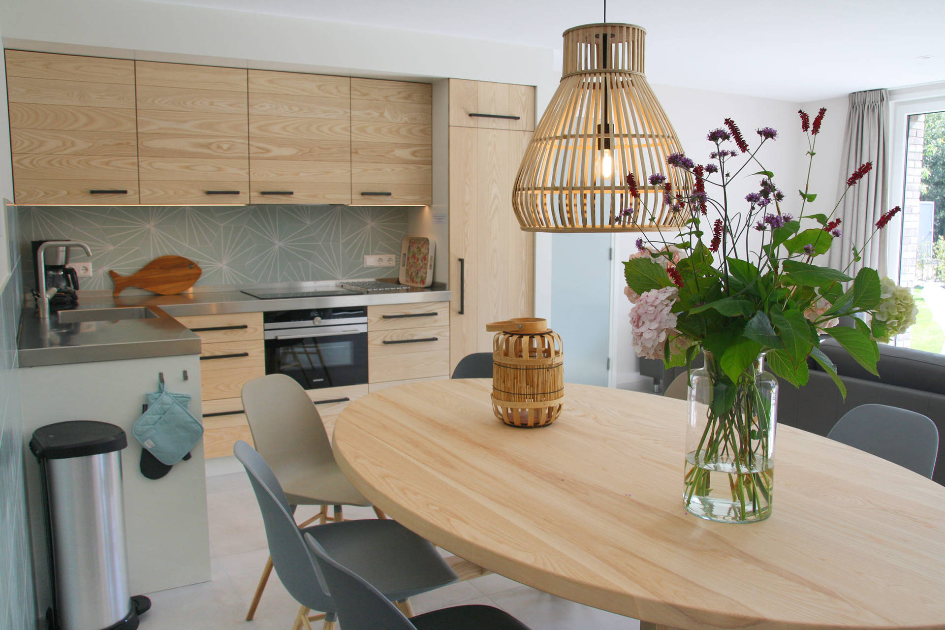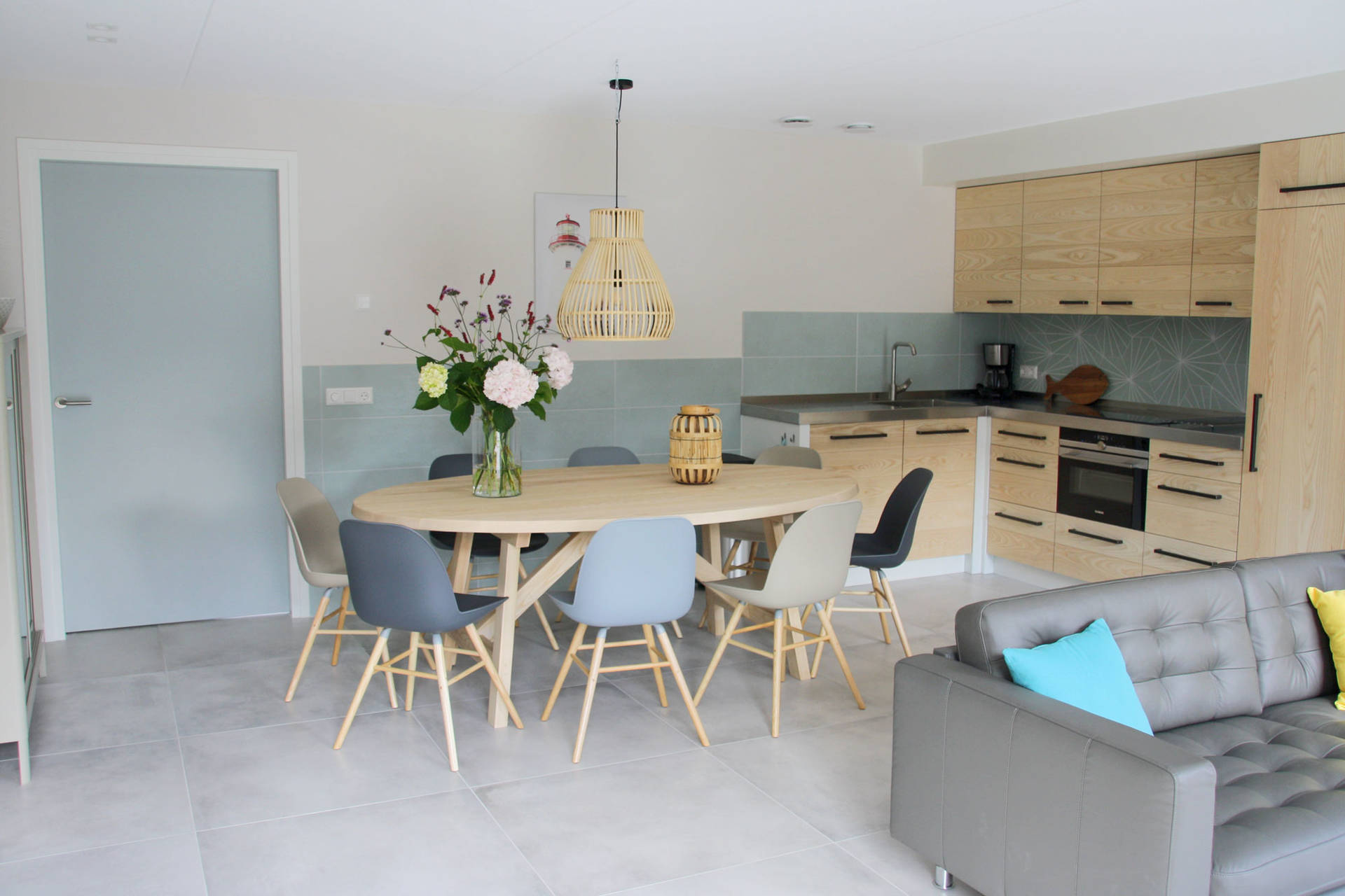 Das Haus hat eine Grundfläche von 90m2 im Erdgeschoss, was sehr angenehm ist, wenn man mit 8 Personen anreist. Das Haus ist geschmackvoll und modern eingerichtet. Im Erdgeschoss befindet sich das Wohnzimmer mit offener Küche und 1 Doppelschlafzimmer mit begehbarer Badezimmer en Suite. Im Wohnzimmer befindet sich ein großer ovaler Tisch, an dem man frühstücken, zu Mittag oder zu Abend essen oder mit der Familie Gesellschaftsspiele spielen kann. Außerdem gibt es einen schönen Sitzbereich zum Entspannen. Die Küche ist mit einem Kühlschrank, einem Gefrierschrank, einem Kombi-Ofen und einem Induktionskochfeld ausgestattet. Durch die Flügeltüren betreten Sie den großen Garten mit einem großen Tisch.