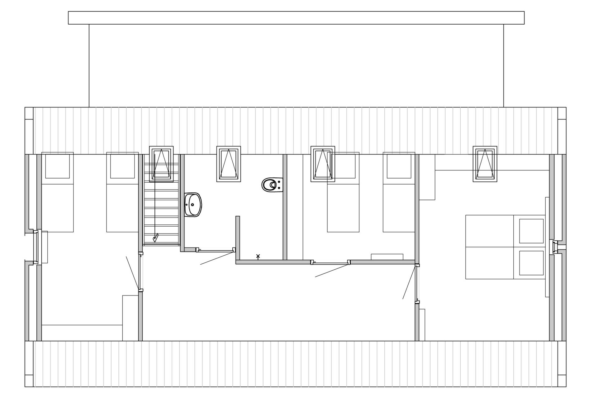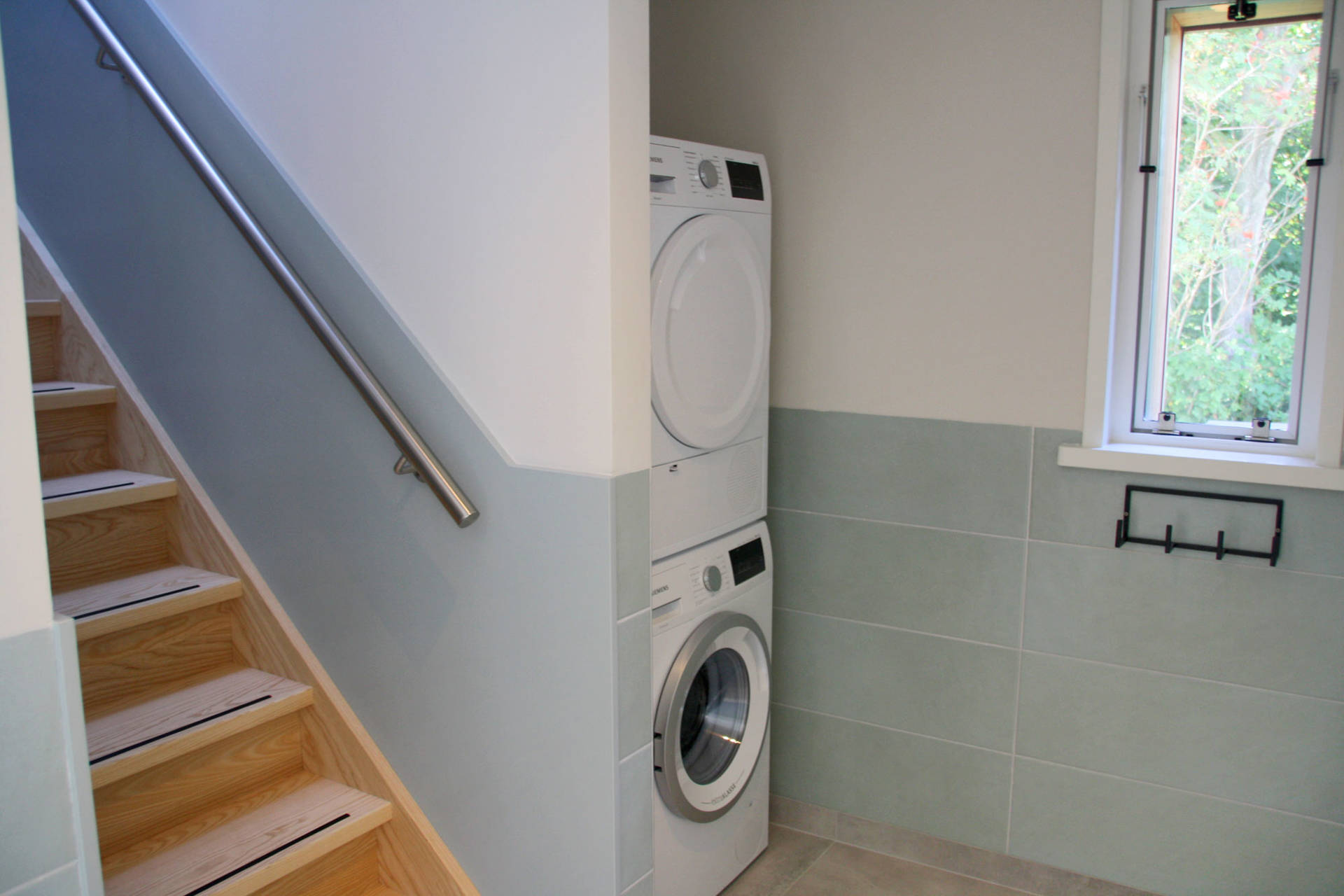 Im Eingangsbereich, wo sich die Treppe nach oben befindet, gibt es eine Gästetoilette sowie eine Waschmaschine und einen Trockner. Im ersten Stock befinden sich die 3 weiteren Schlafzimmer mit je 2 Einzel-Boxspringbetten. Im Obergeschoss befindet sich außerdem ein zweites Badezimmer mit Doppelwaschbecken, Toilette und Dusche.