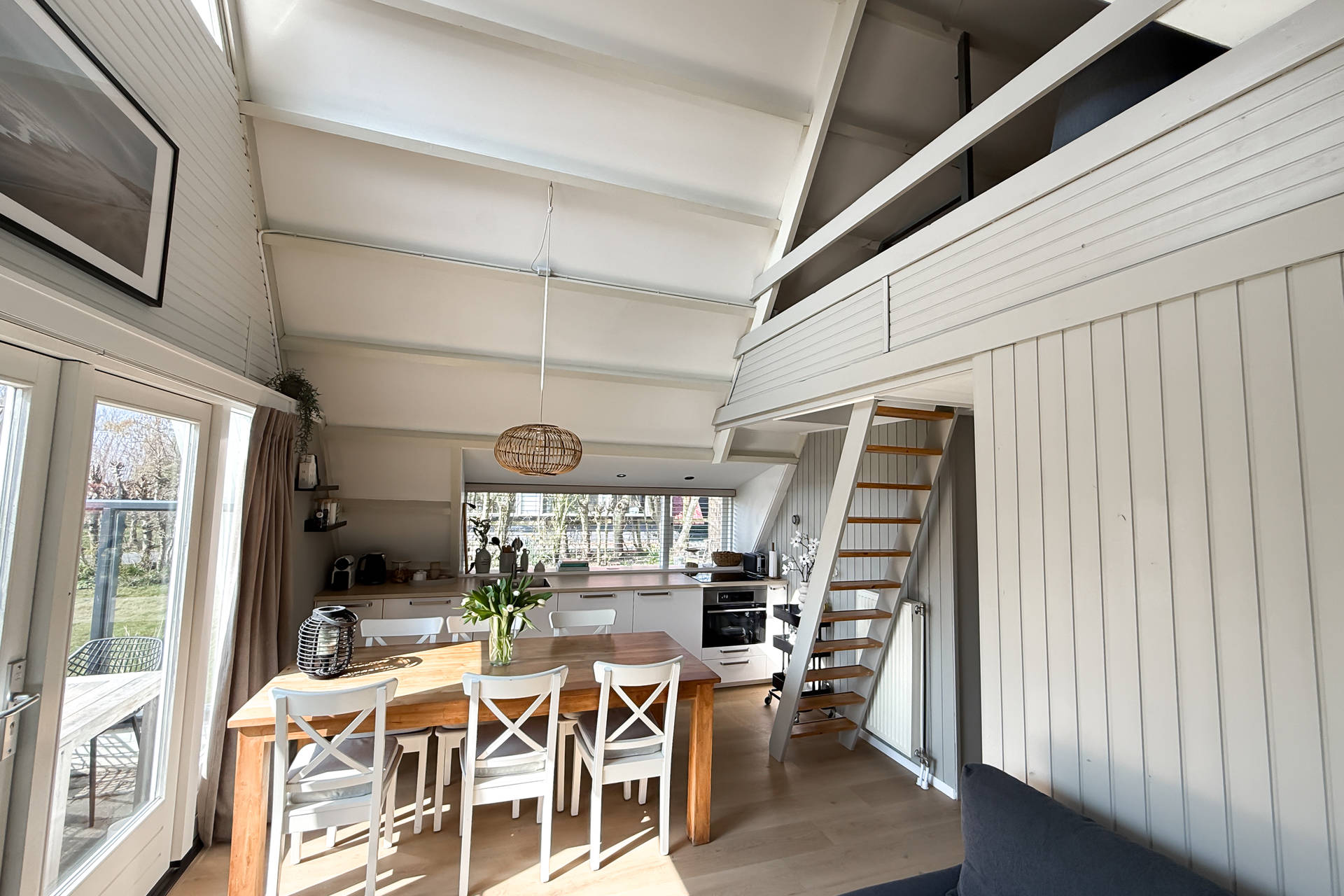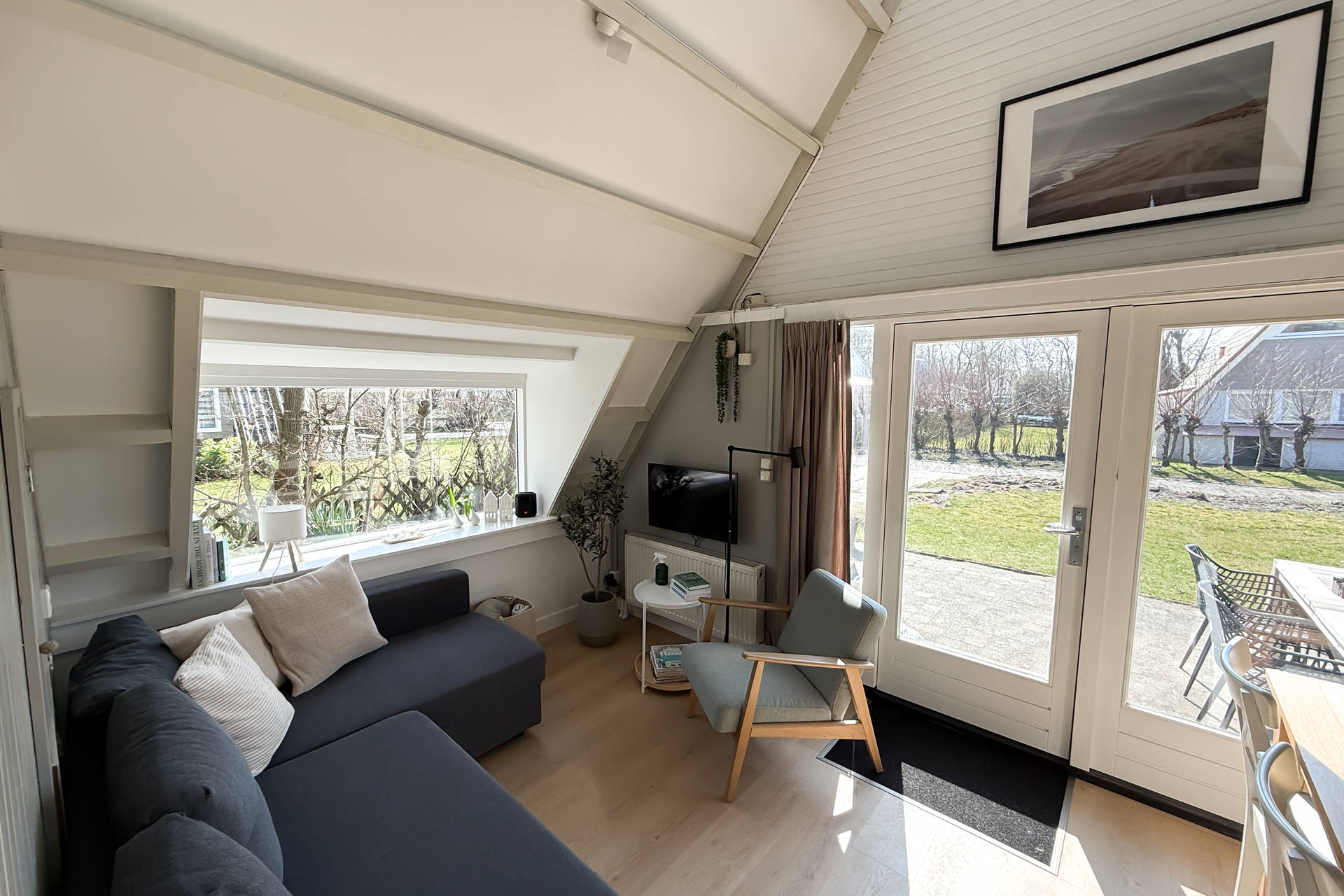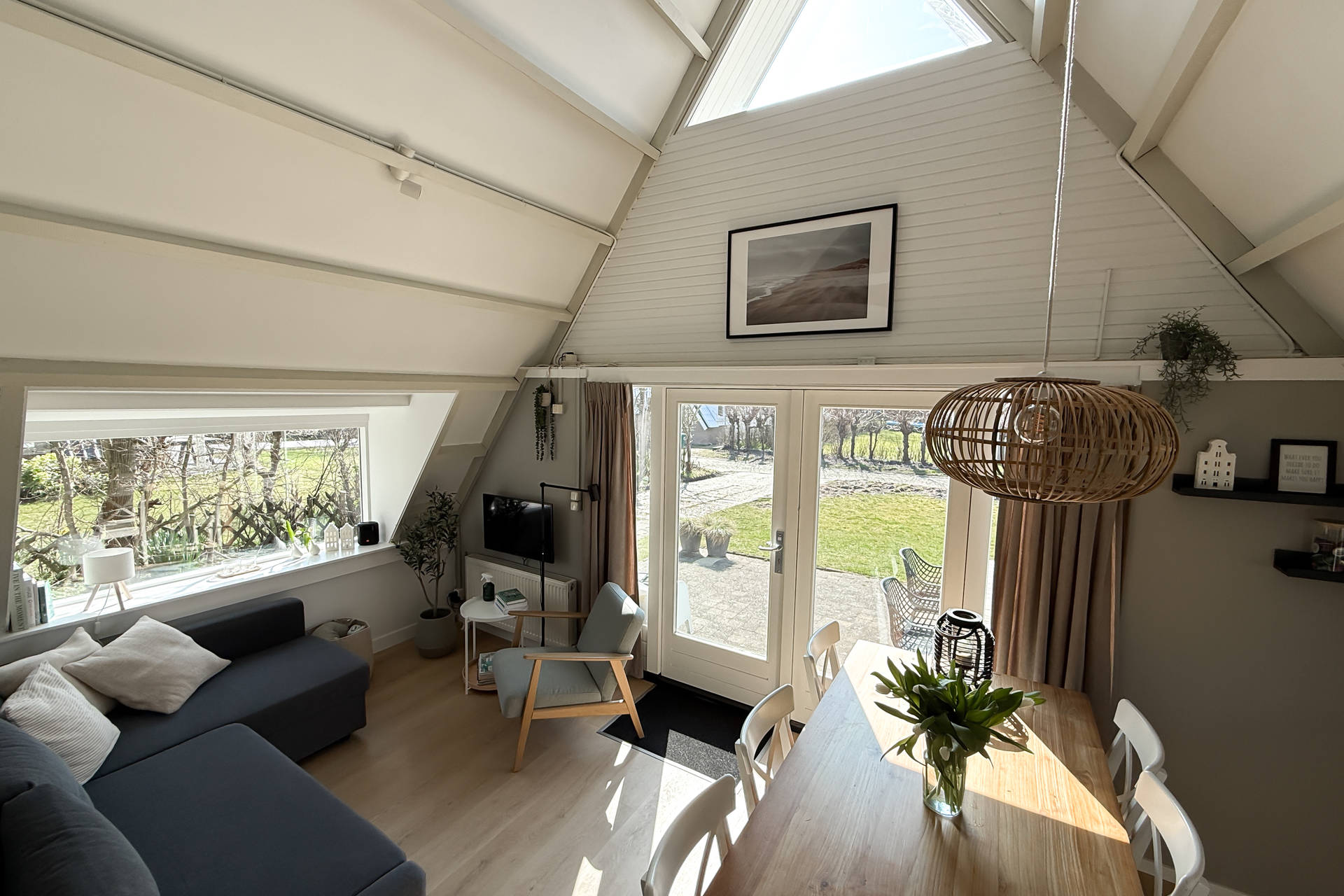 Sie betreten das Haus im Wohnzimmer mit der Küche auf der einen Seite. Die Küche ist voll ausgerüstet mit Herd, Kaffeemaschine, Nespresso, Wasserkocher, Airfryer und nicht zu vergessen einer Spülmaschine. Das offene Wohnzimmer verfügt über eine gemütliche Sitzecke und vermittelt eine schöne und geschmackvolle Strand-Atmosphäre. Ein Tür gibts Zugang zum Westen mit dem geräumigen Garten und Terrasse.