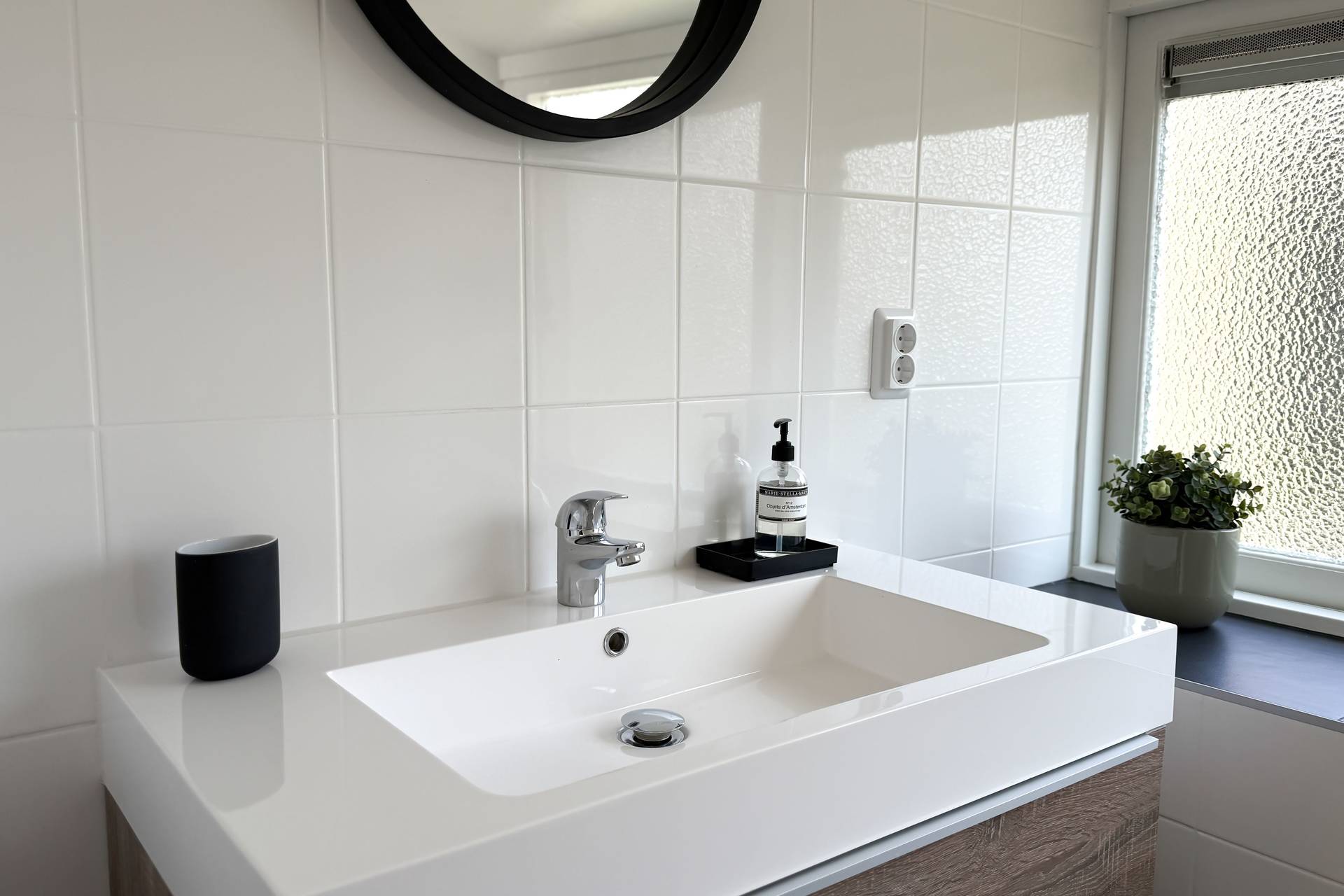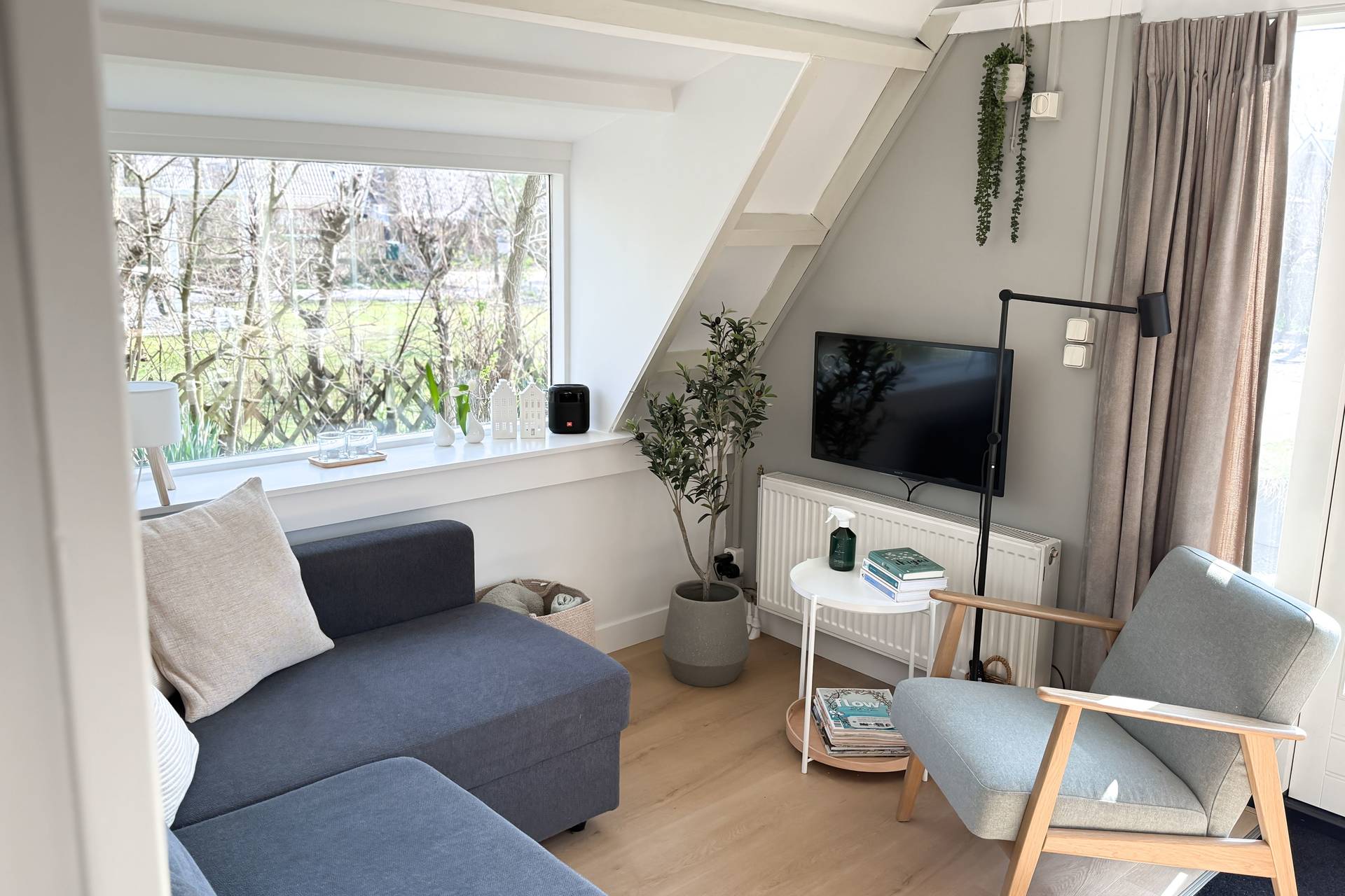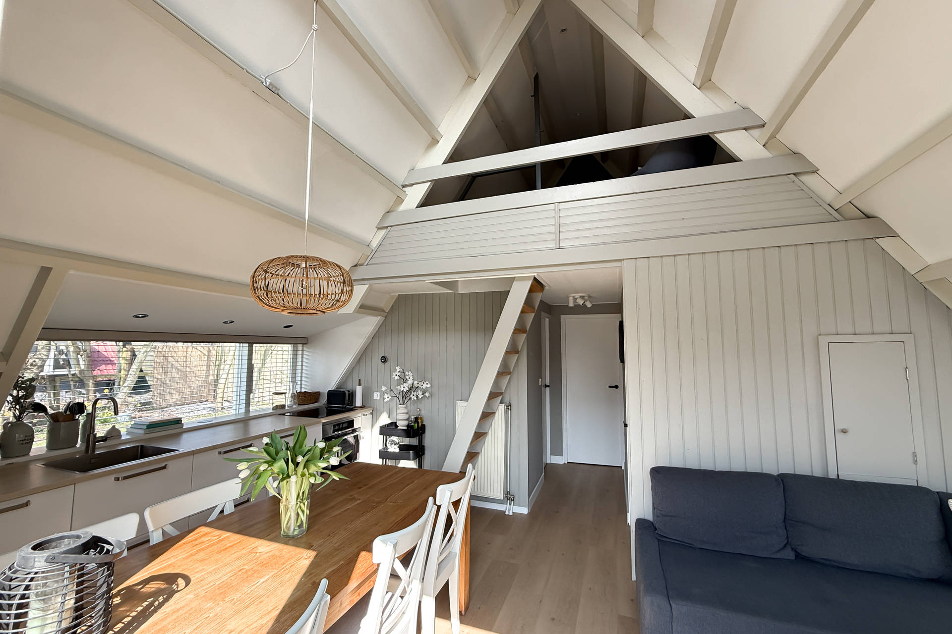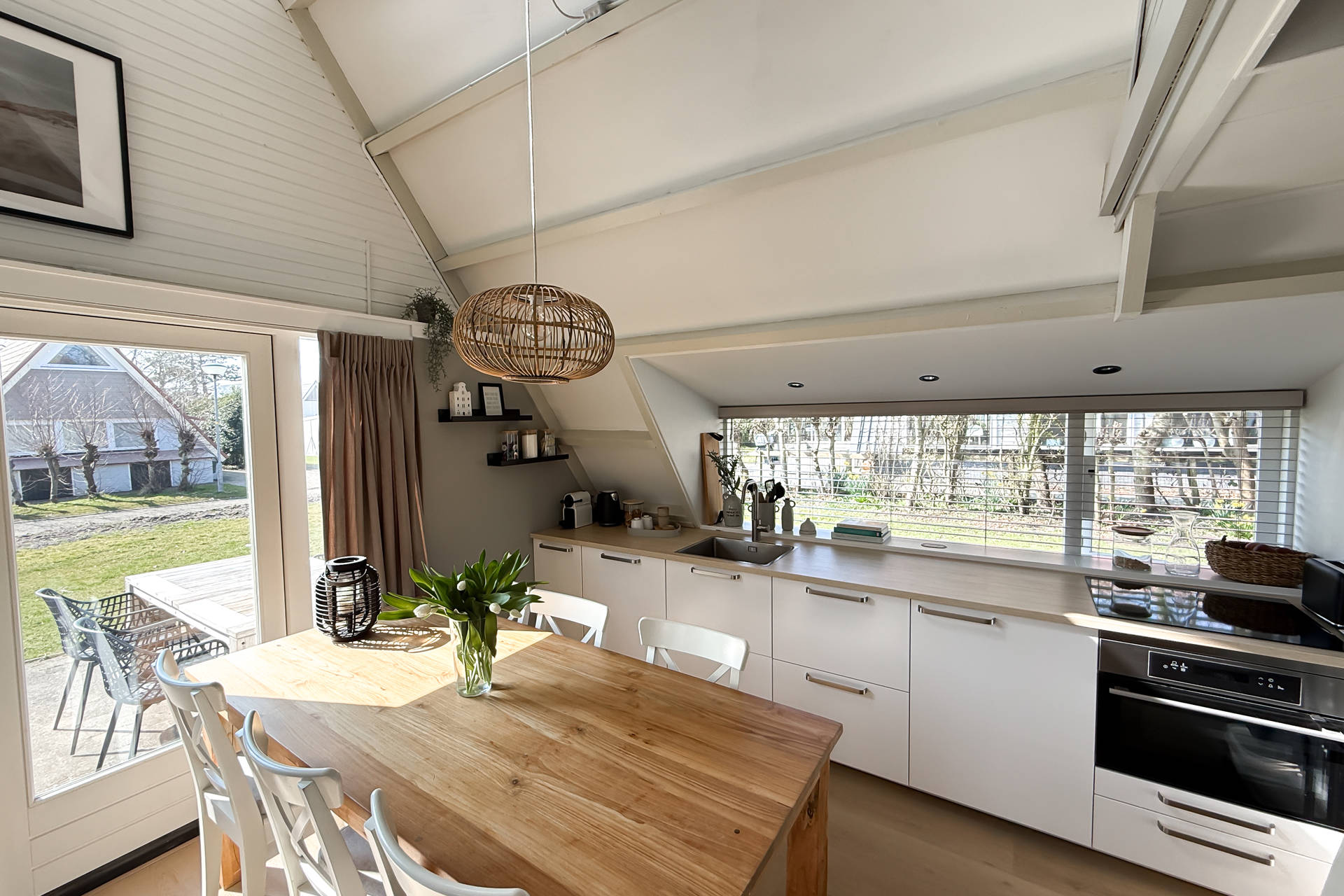 Sie betreten das Haus im Wohnzimmer mit der Küche auf der einen Seite. Die Küche ist voll ausgerüstet mit Herd, Kaffeemaschine, Nespresso, Wasserkocher, Airfryer und nicht zu vergessen einer Spülmaschine. Das offene Wohnzimmer verfügt über eine gemütliche Sitzecke und vermittelt eine schöne und geschmackvolle Strand-Atmosphäre. Ein Tür gibts Zugang zum Westen mit dem geräumigen Garten und Terrasse.