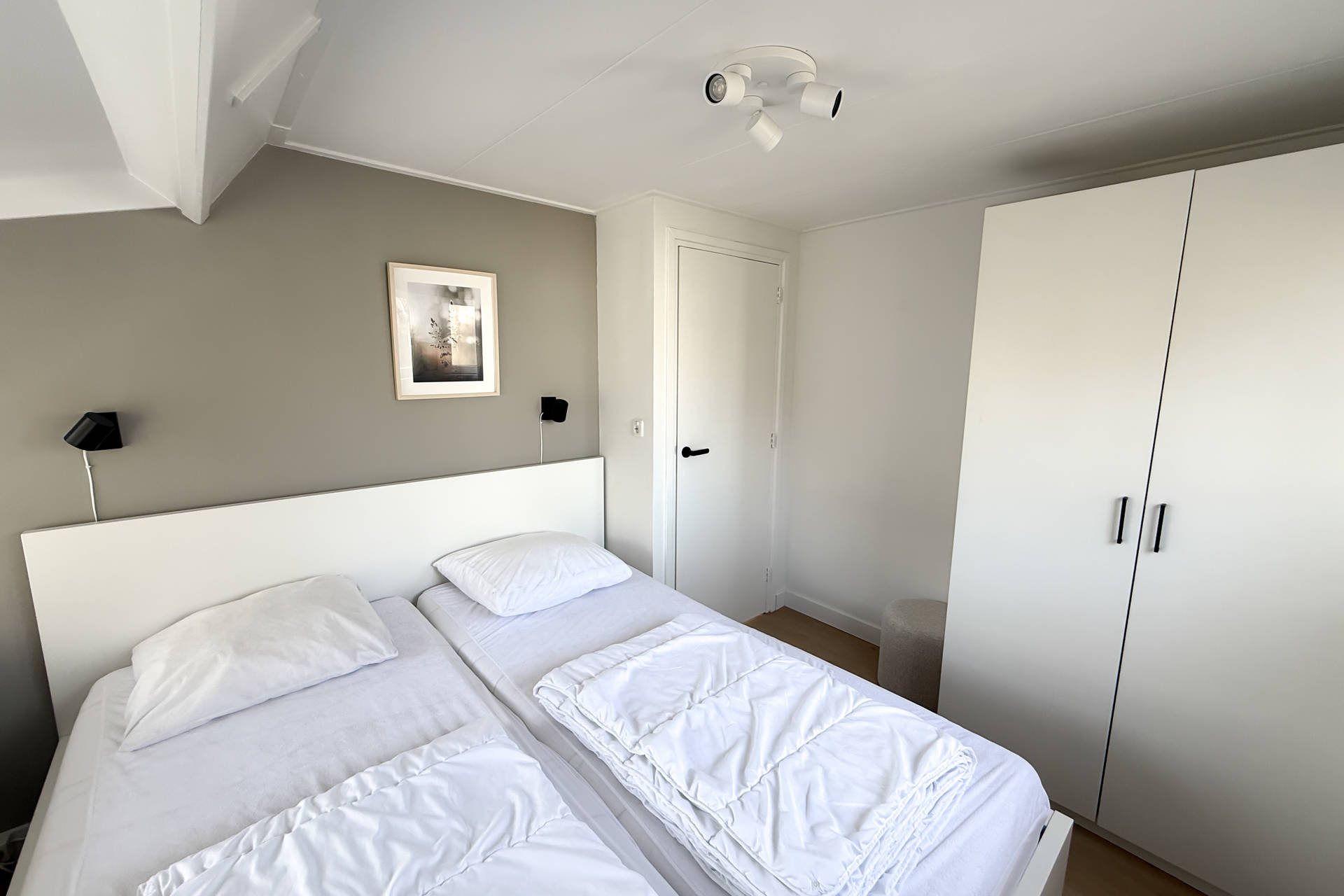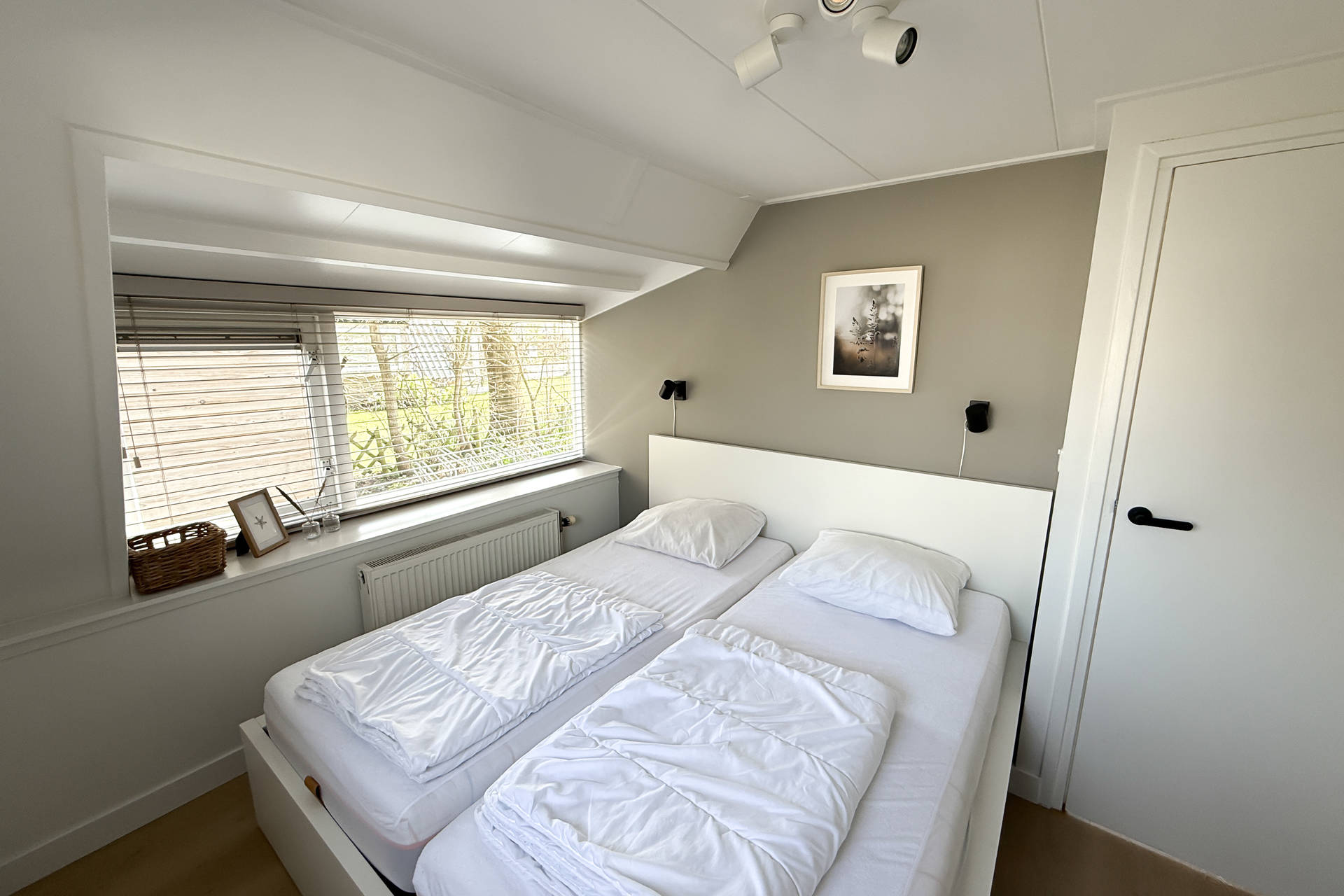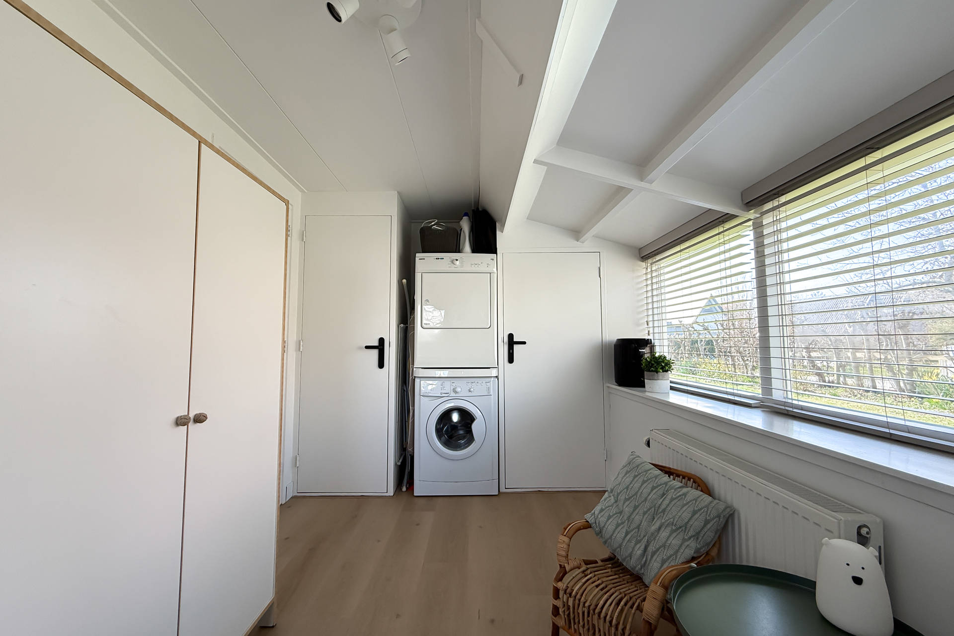 Die Schlafzimmer und Bad können vom Flur auf der Rückseite aus betreten werden. Ein Schlafzimmer hat Platz für 1 Bett und eine Waschmaschine und Trockner, was ideal ist in den Ferien. Das andere Schlafzimmer hat ein Bett für 2 Personen. Das helle Badezimmer verfügt über eine gute Duschkabine, Toilette und Waschbecken.