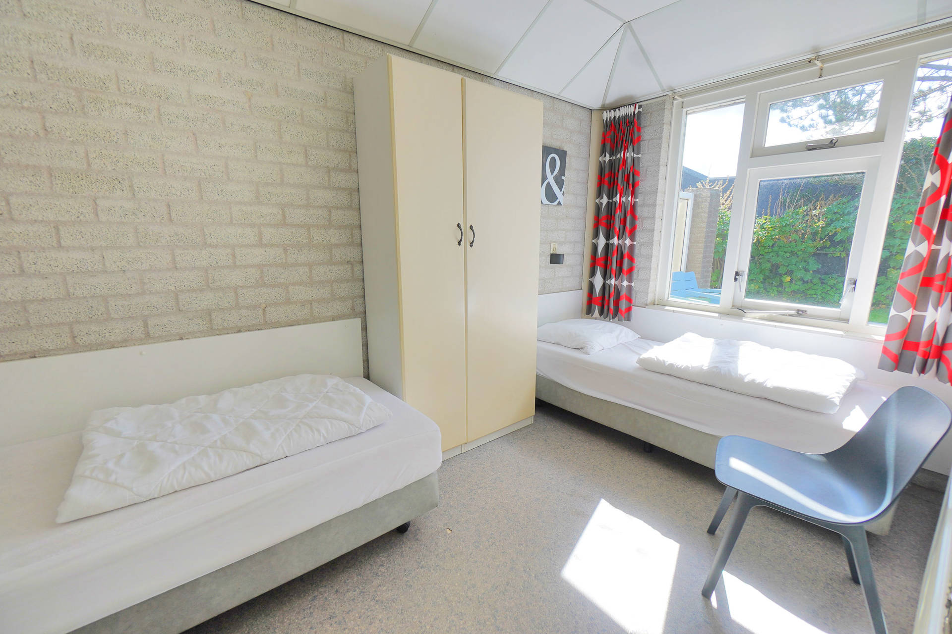 Die Ferienwohnung hat ein Wohnzimmer mit offener Küche und Schiebetüren zur Terrasse. Alle Zimmer sind im Erdgeschoss (Wohnzimmer mit offener Küche, 1 Schlafzimmer mit einem Doppelbett mit 2 Einzelmatratzen, 1 Schlafzimmer mit 2 Einzelbetten, Badezimmer mit eine Toilette.).