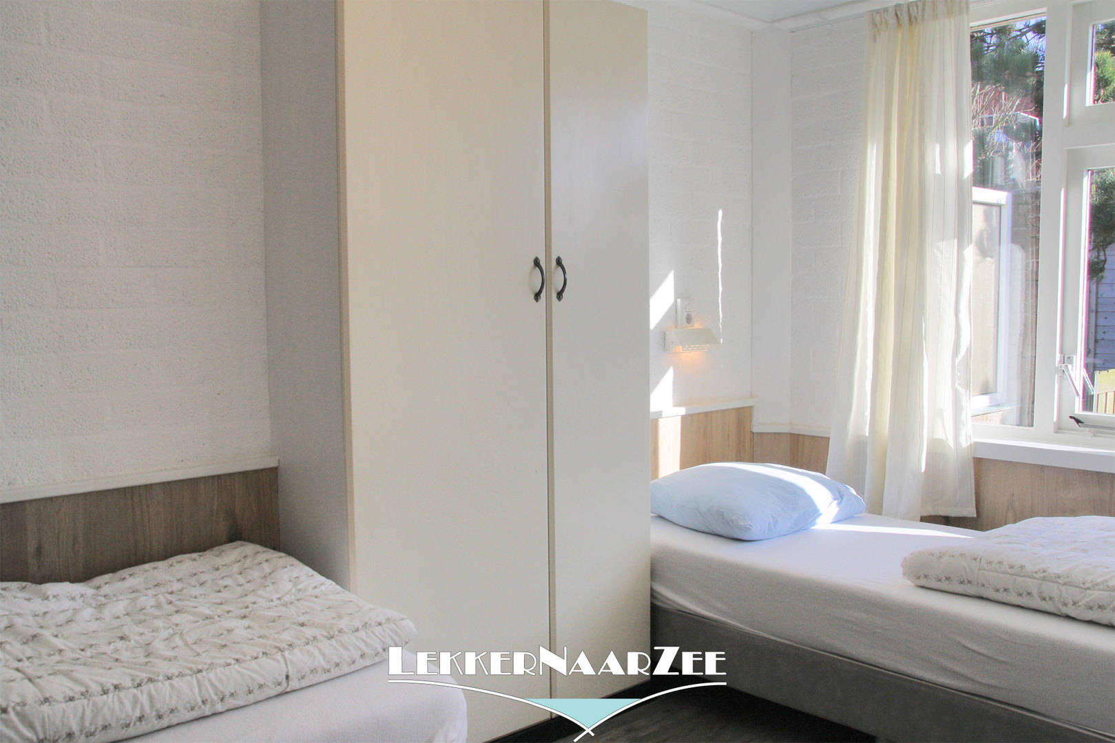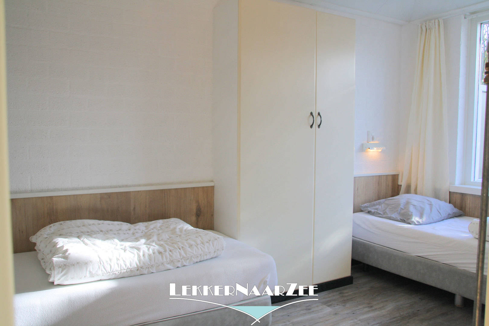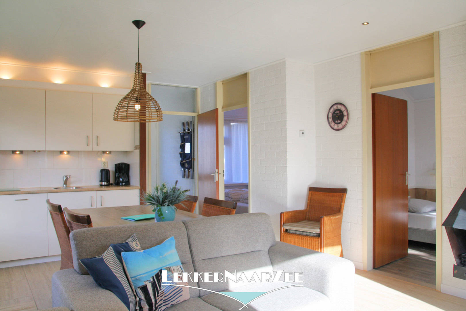 Alle Zimmer sind im Erdgeschoss (Wohnzimmer mit offener Küche, zwei Schlafzimmer, Bad und WC). Das Haus hat 1 Schlafzimmer mit einem Doppelbett mit 2 Einzelmatratzen, und 1 Schlafzimmer mit 2 Einzelbetten. Der Bungalow ist komplett für vier Personen eingerichtet.