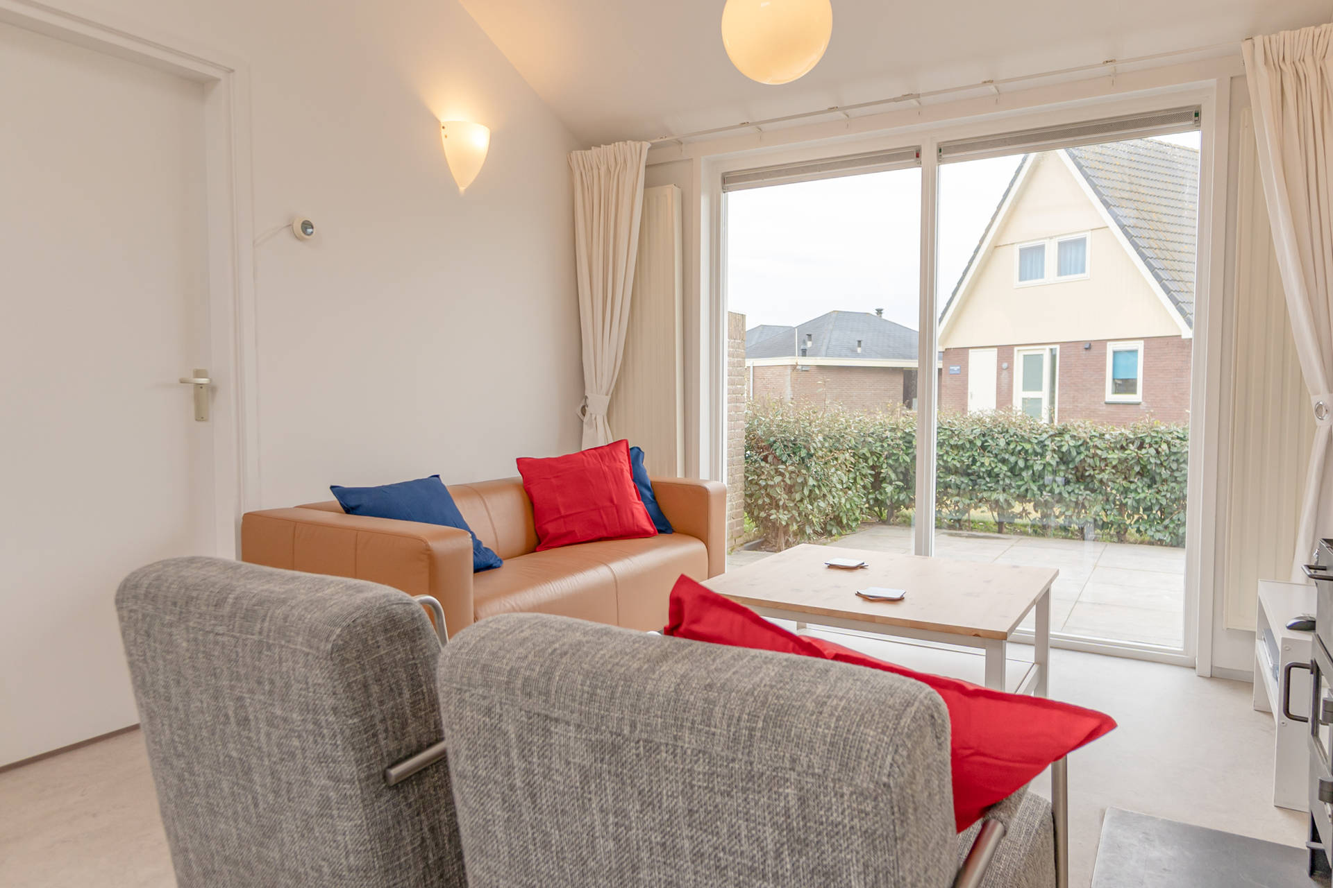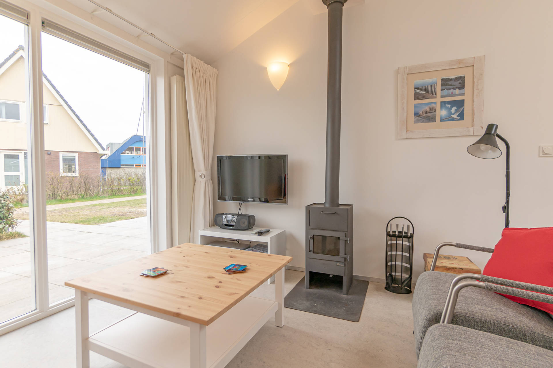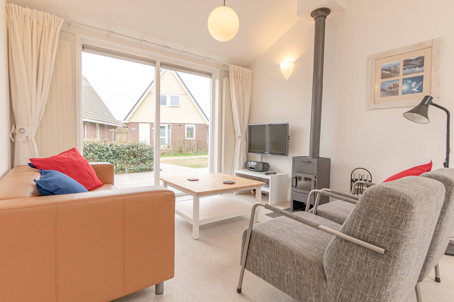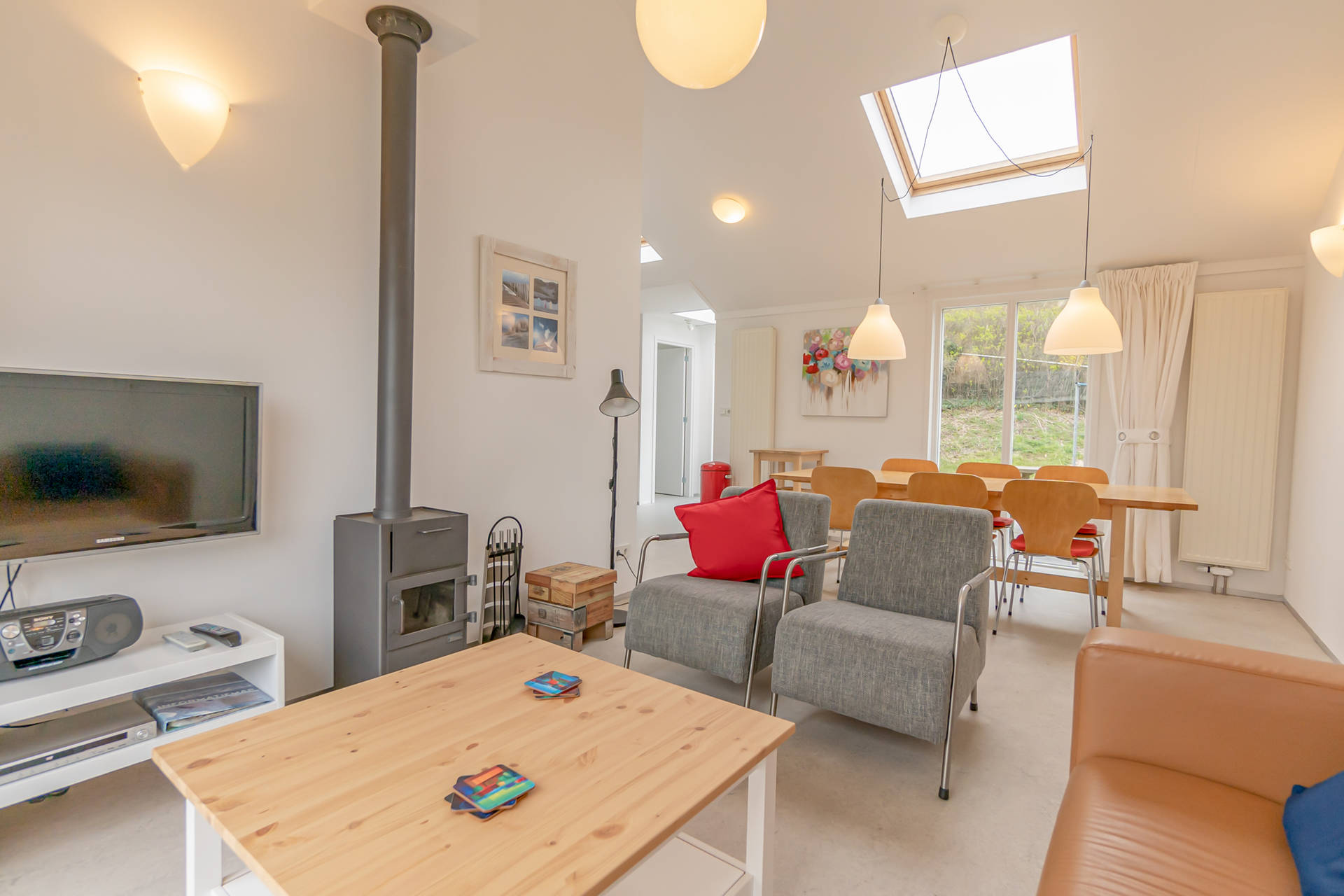 Das helle Wohnzimmer mit schöner Sitzecke grenzt an die offene Küche. Der moderne und leichte Look von Seinpost 2 ist sehr gemütlich. Das Haus befindet sich auf einer Ebene, alle Zimmer sind im Erdgeschoss.