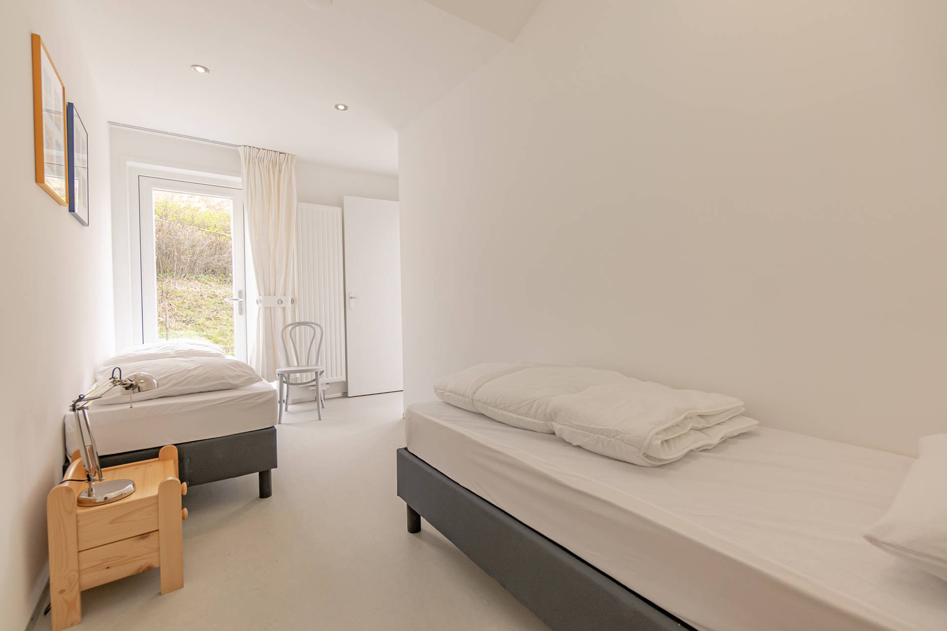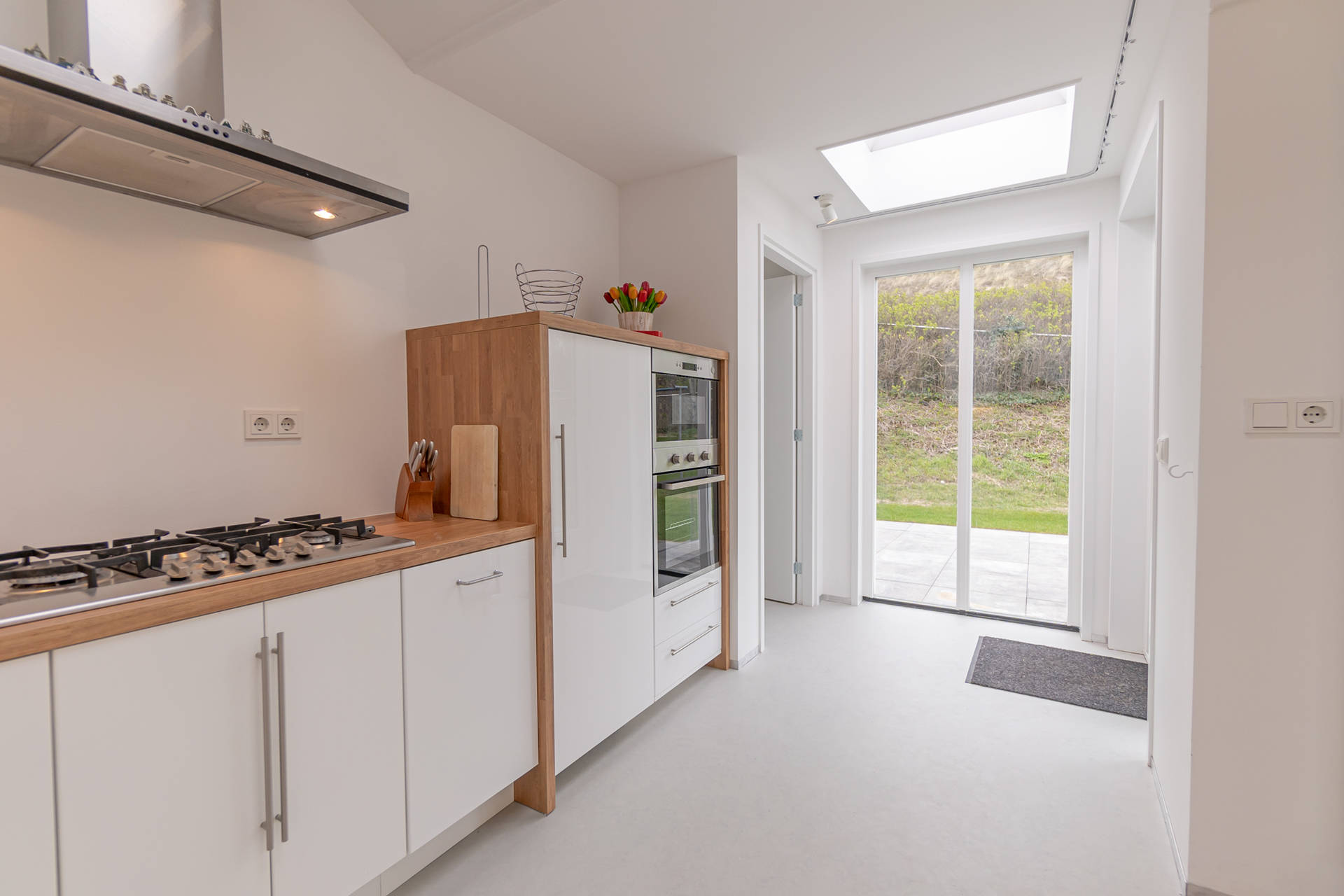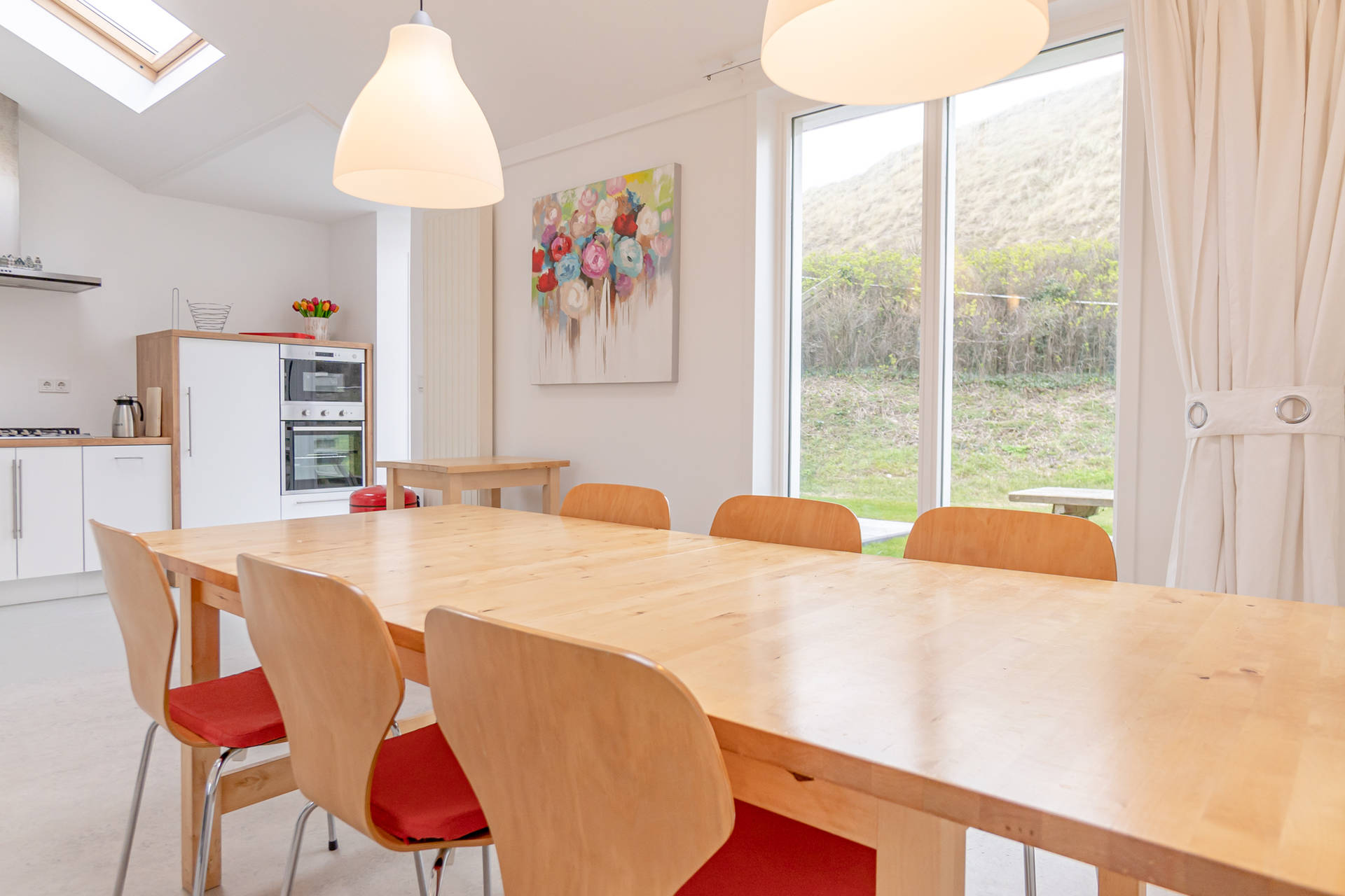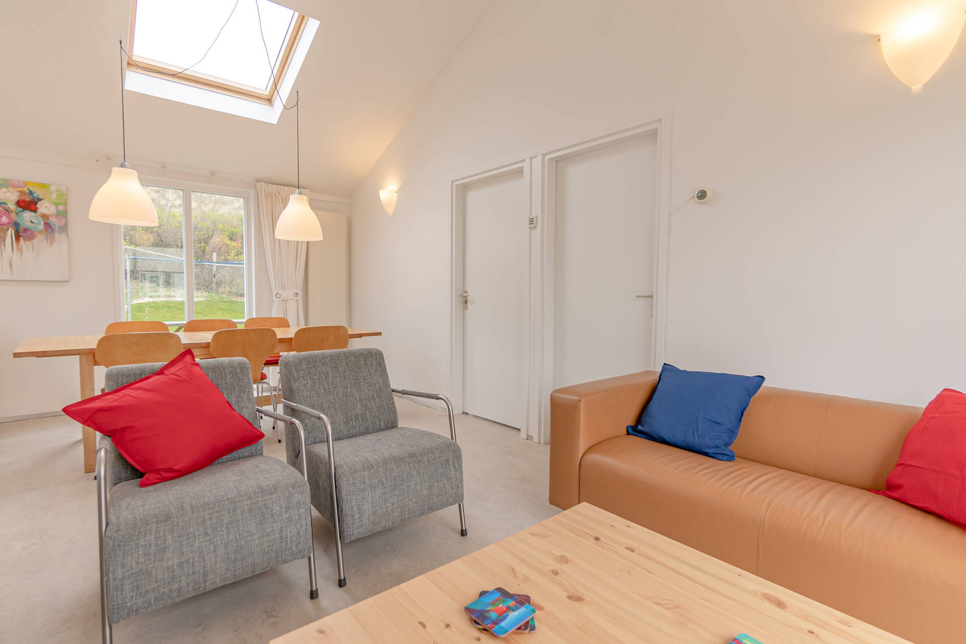 Das helle Wohnzimmer mit schöner Sitzecke grenzt an die offene Küche. Der moderne und leichte Look von Seinpost 2 ist sehr gemütlich. Das Haus befindet sich auf einer Ebene, alle Zimmer sind im Erdgeschoss.
