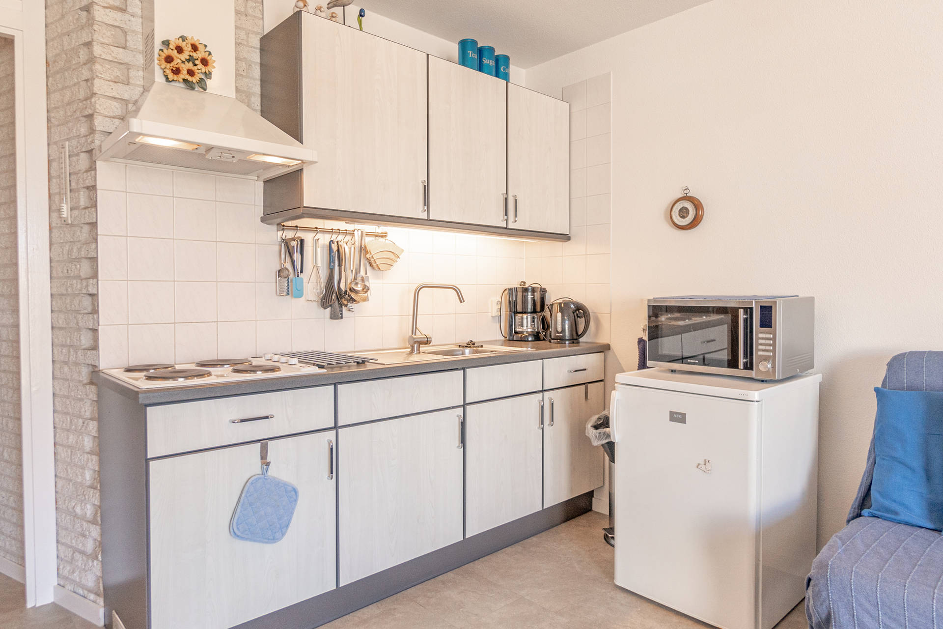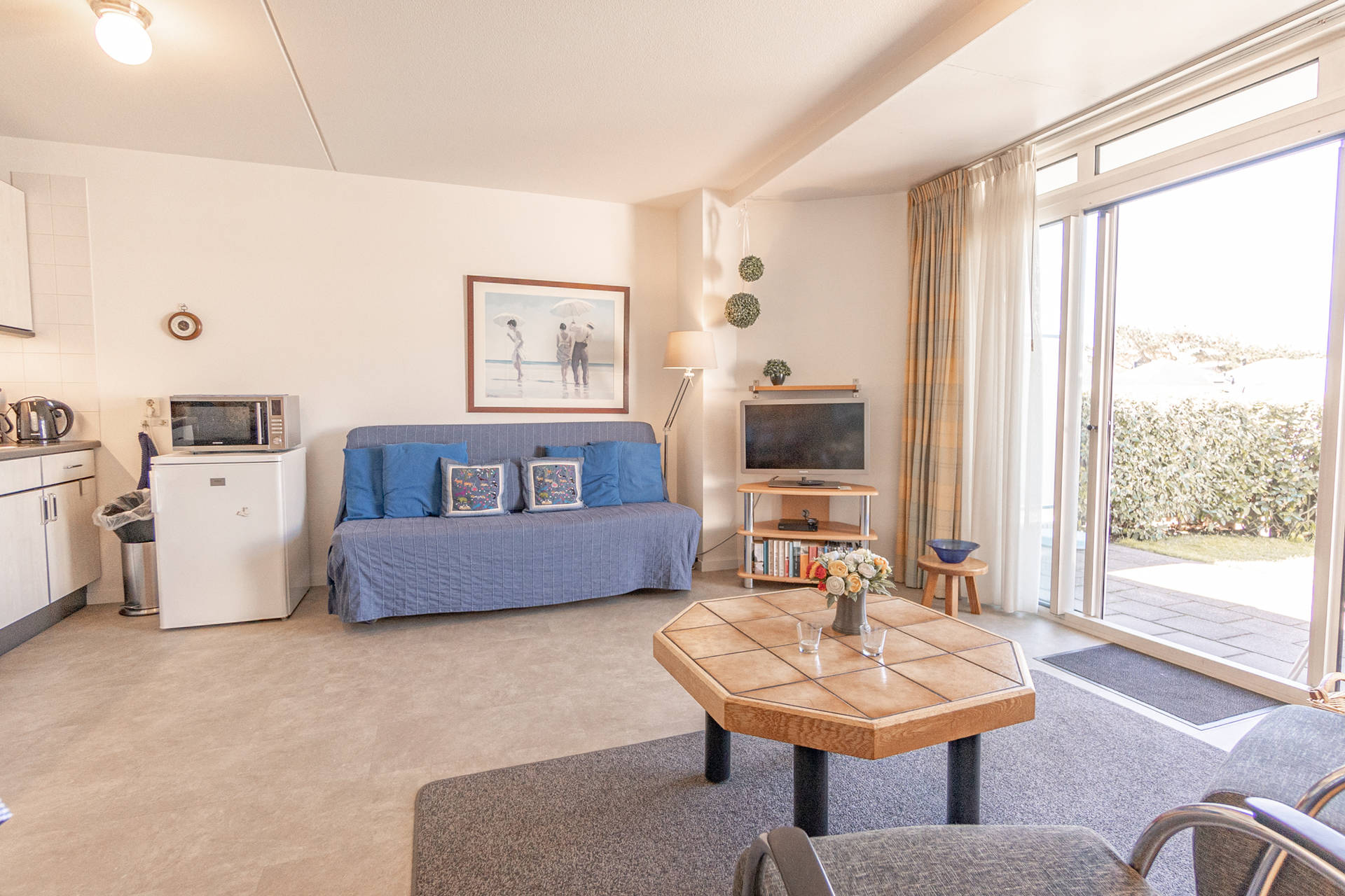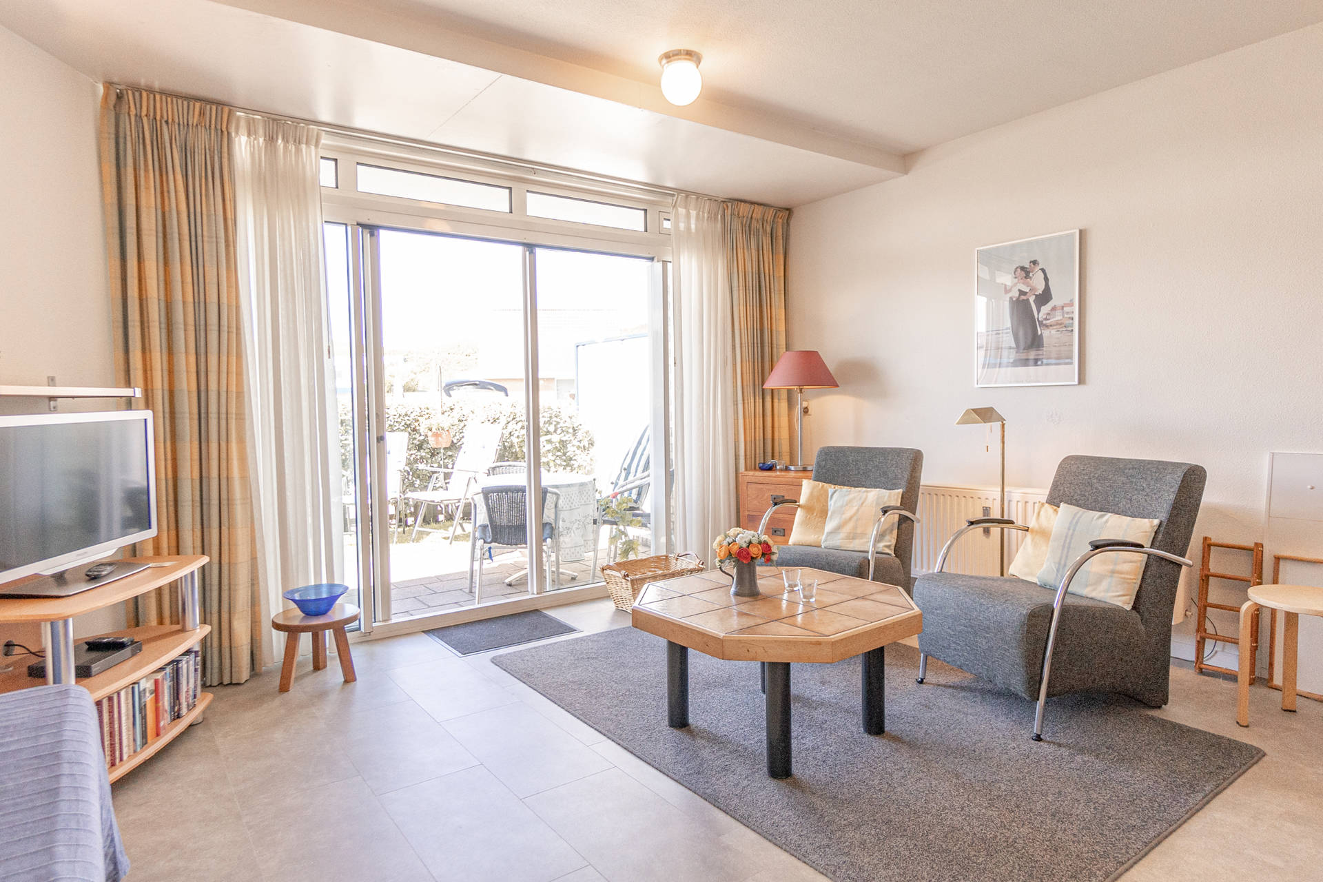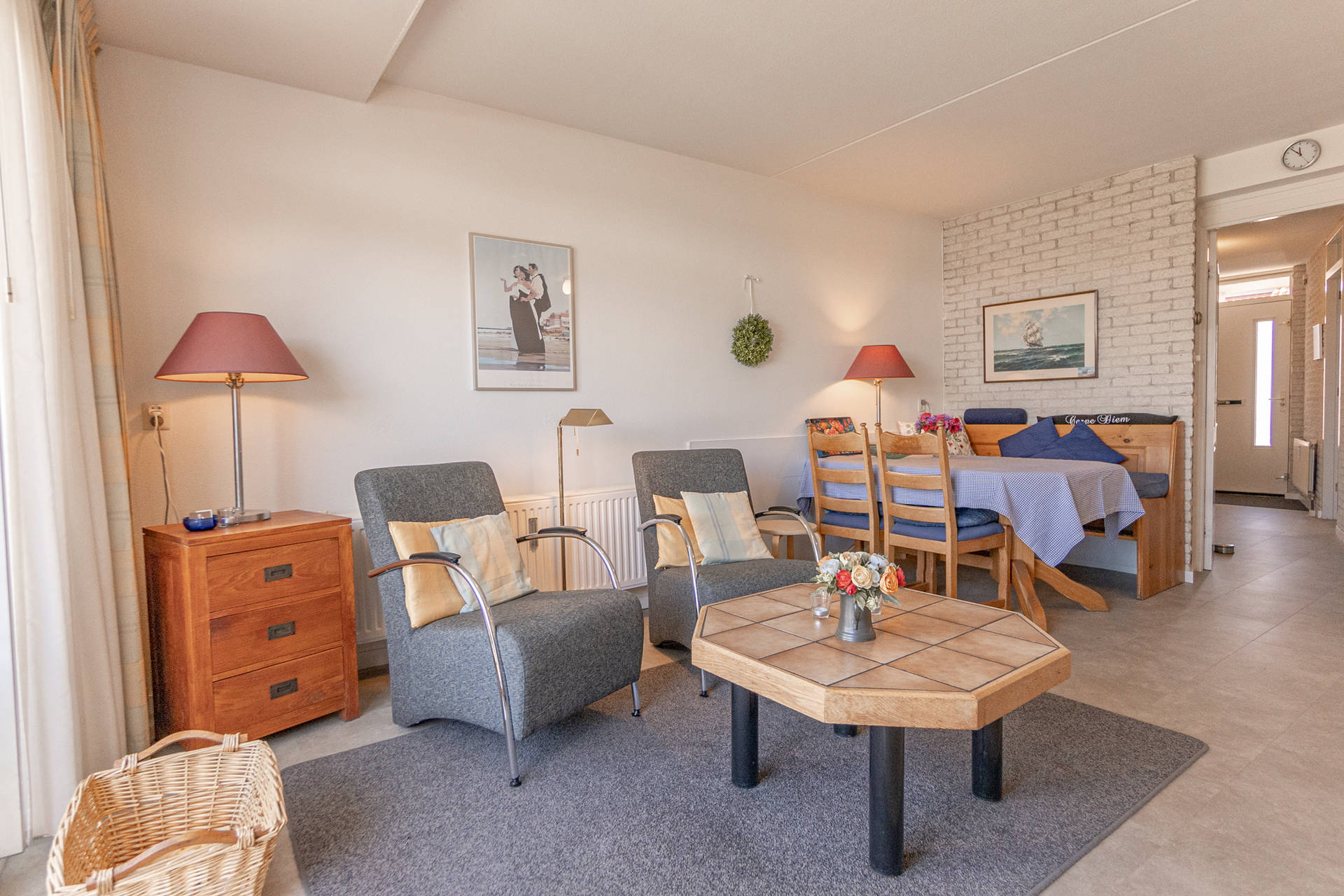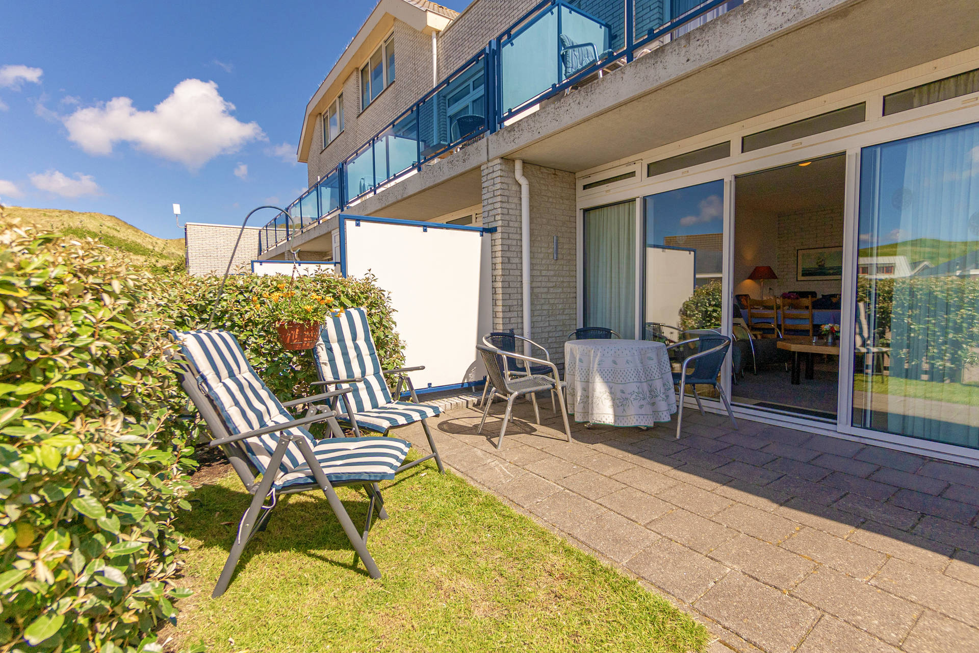 Die offene Küche ist mit einem Kombi-Backofen, einer Kaffeemaschine, einer Nespresso-Kaffeemaschine, einem Wasserkocher, einem Kühlschrank mit Gefrierfach und einem 4-Flammen-Herd ausgestattet. Durch die Schiebetür im Wohnzimmer können Sie den schönen Garten im Südwesten betreten. Von einem Sitzplatz aus können Sie die Aussicht auf die Dünen genießen. Am Abend können Sie sehen, wie die Sonne hinter den Dünen untergeht.