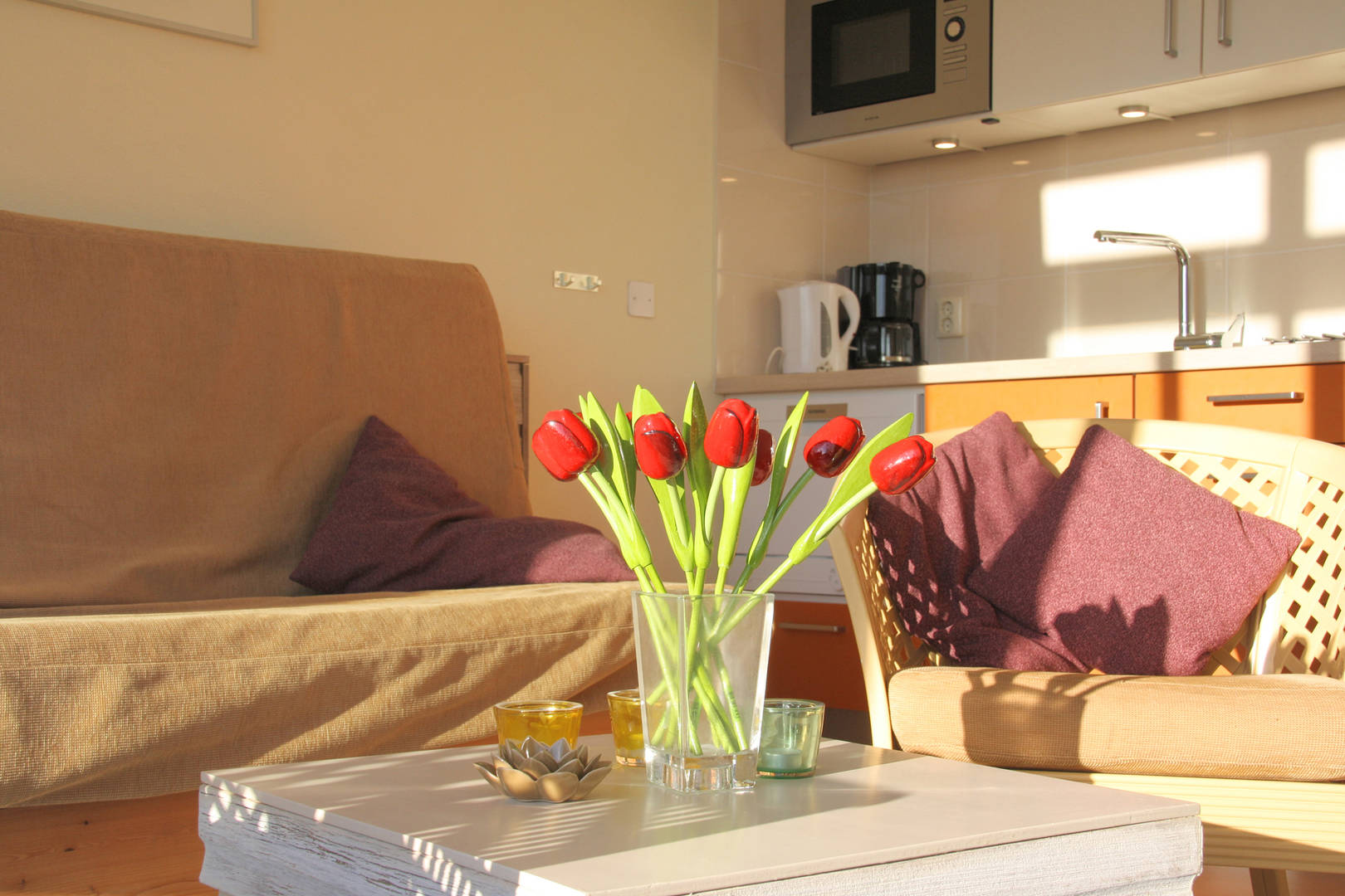 Die Wohnzimmer in Südliche Lage hat eine offene Küche mit 4-Plattenherd und Mikrowelle mit Grill und Geschirrspüler. Die Küche verfügt unter anderem über einen Kühlschrank mit Gefrierfach, Toaster, Kaffeemaschine und Wasserkocher. Es gibt einen separaten Essbereich und Wohnbereich mit TV, CD-DVD-Player und Radio.