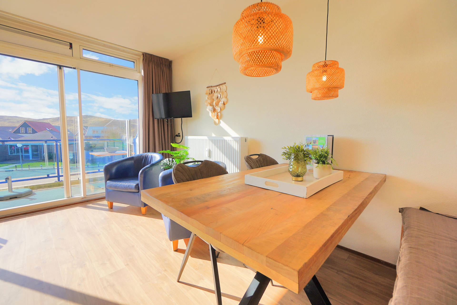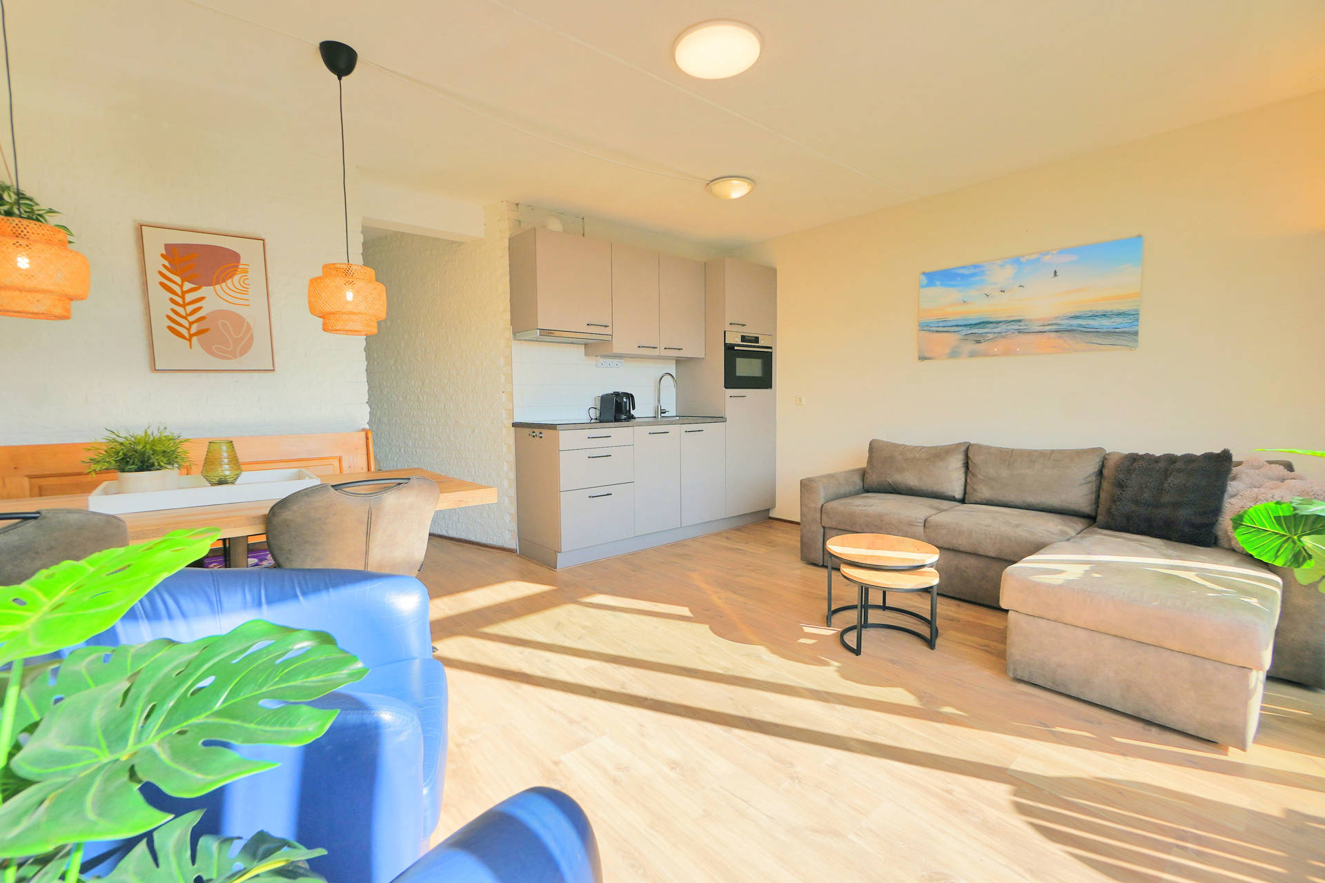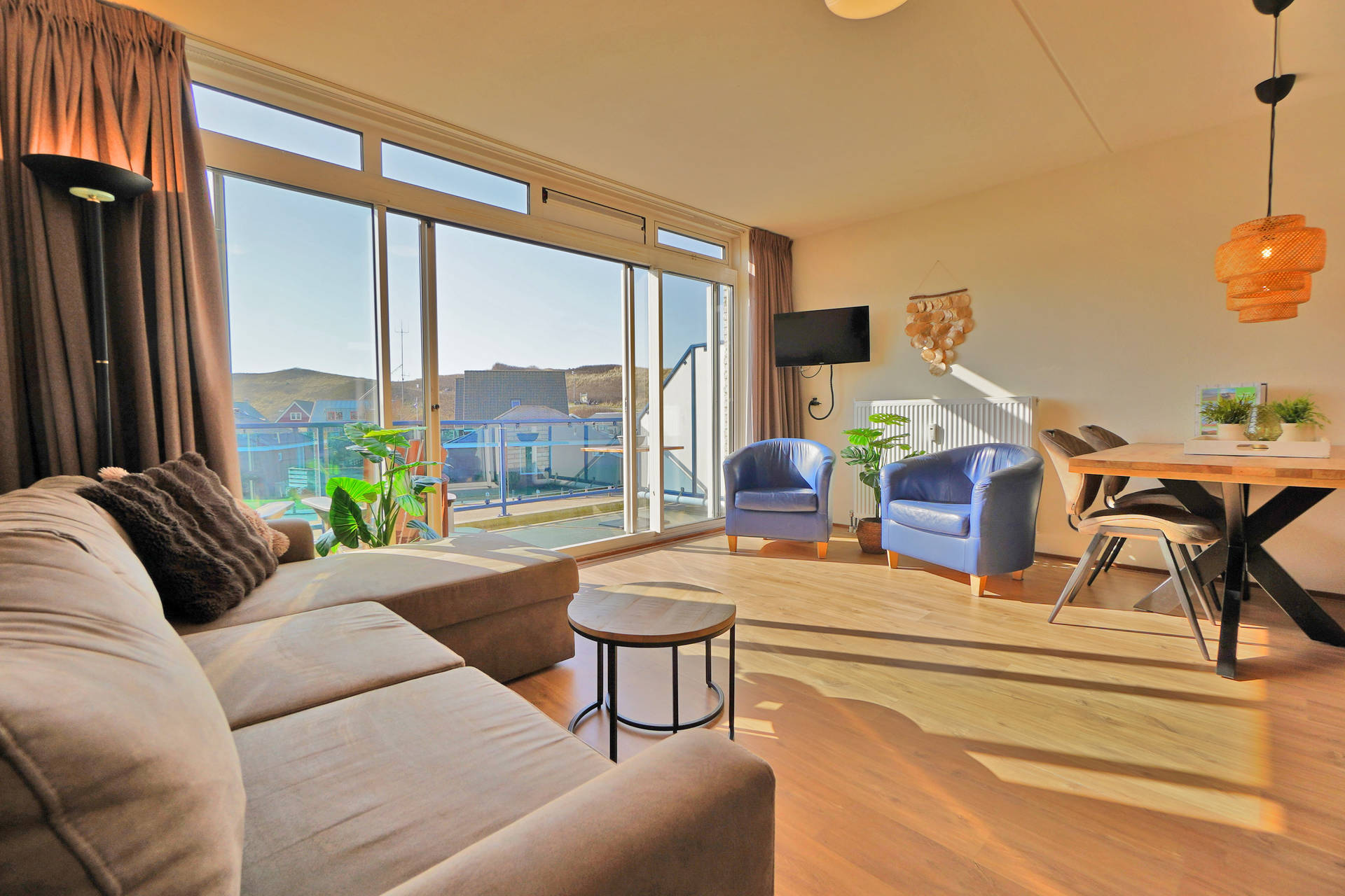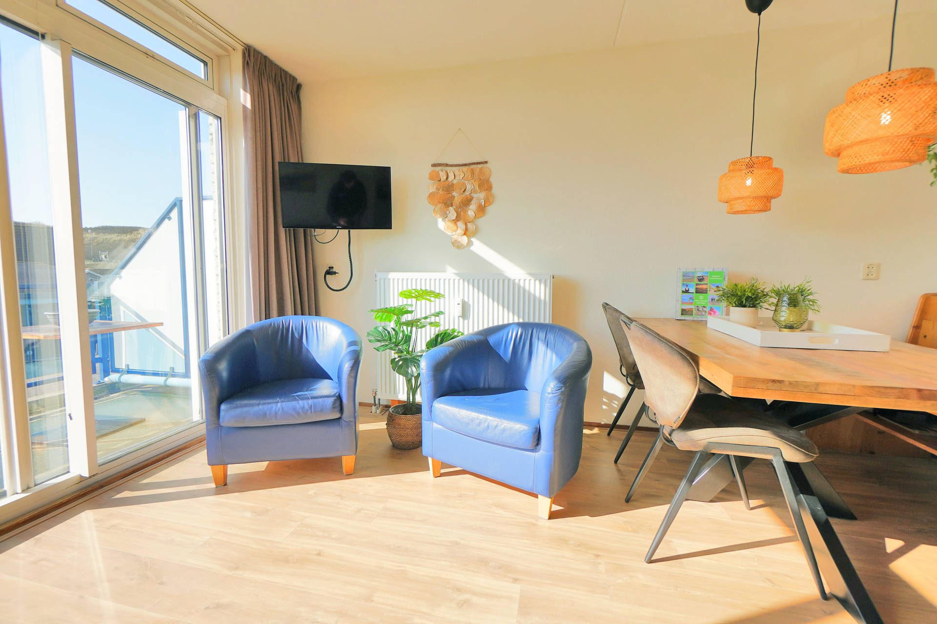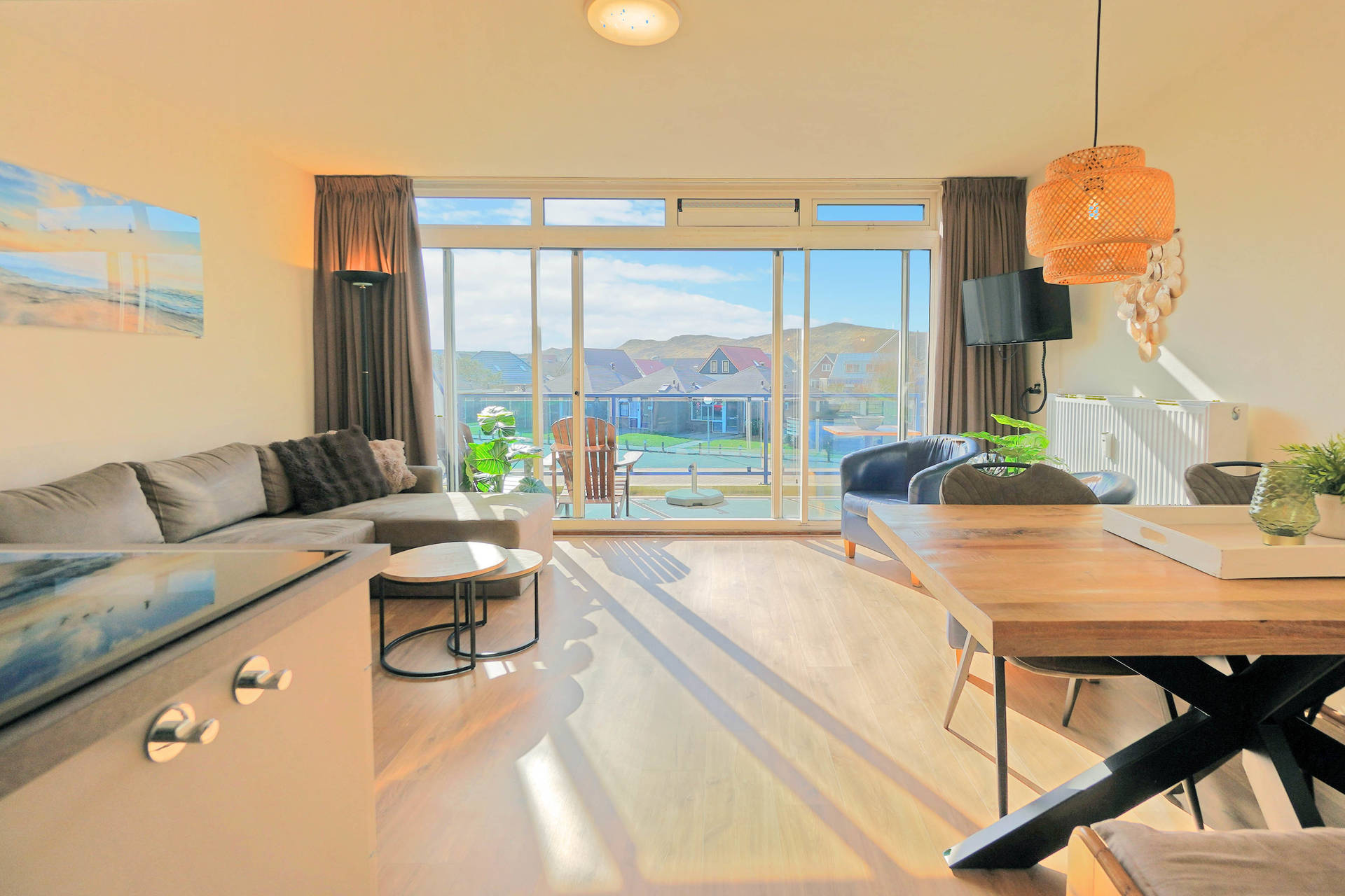 Das helle Wohnzimmer mit Flügeltüren zur Terrasse bietet eine wunderbare Aussicht auf die Dünen. Das Wohnzimmer hat eine offene Küche, einen Esstisch für vier Personen und eine TV-Sitzecke mit Stühlen und einem Sofa.