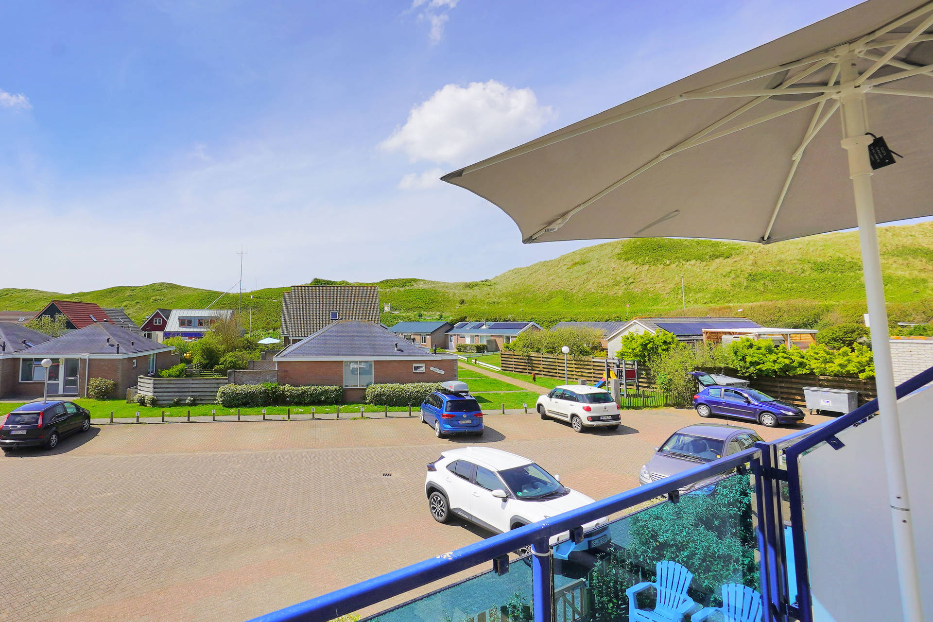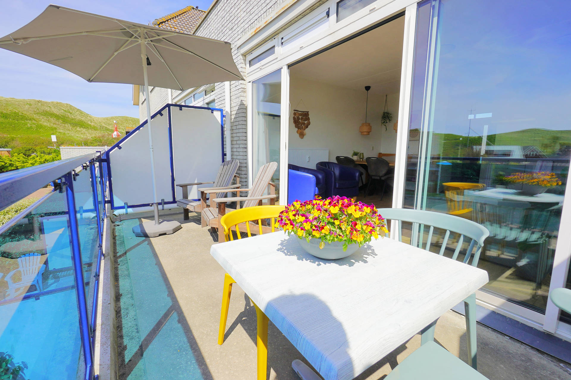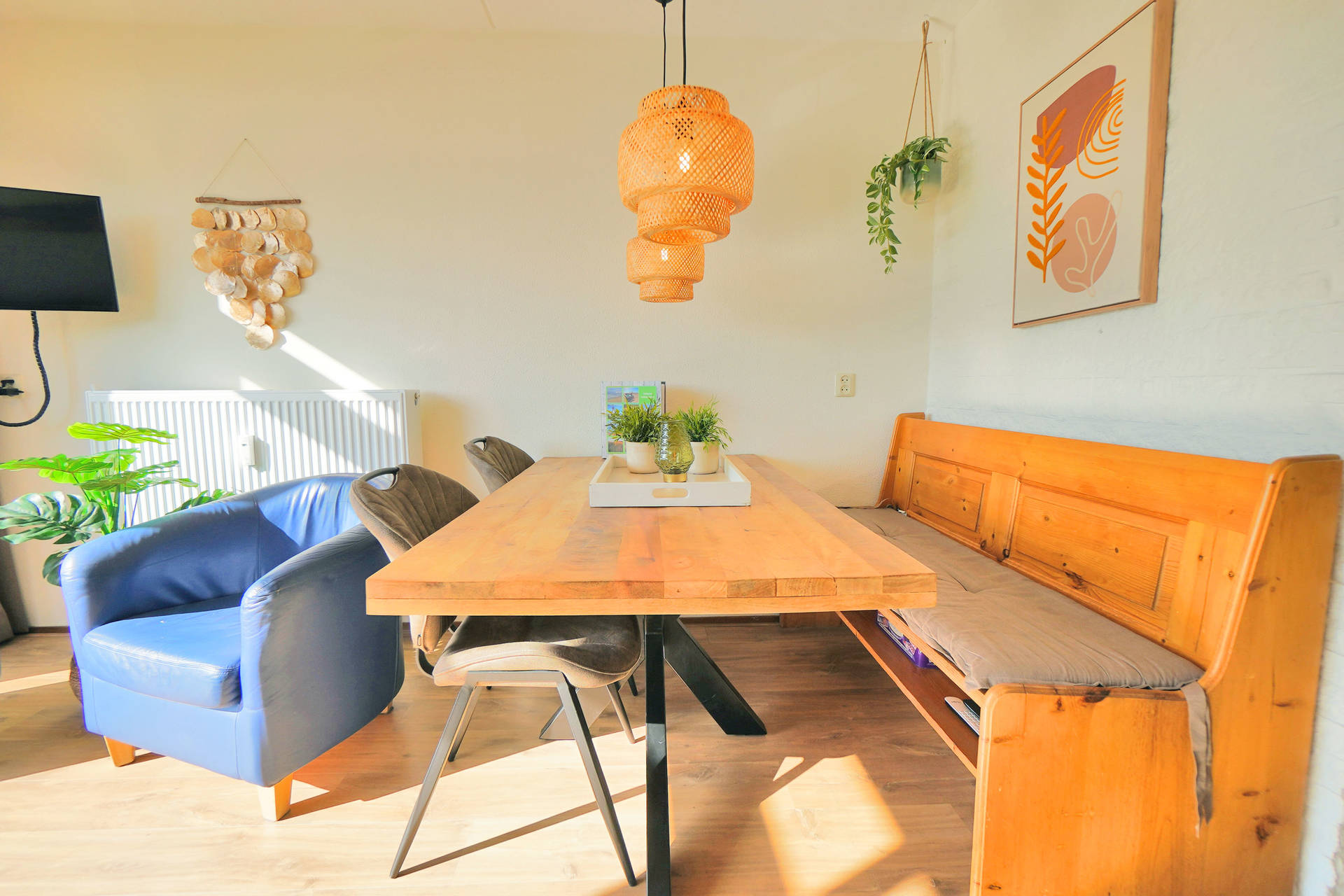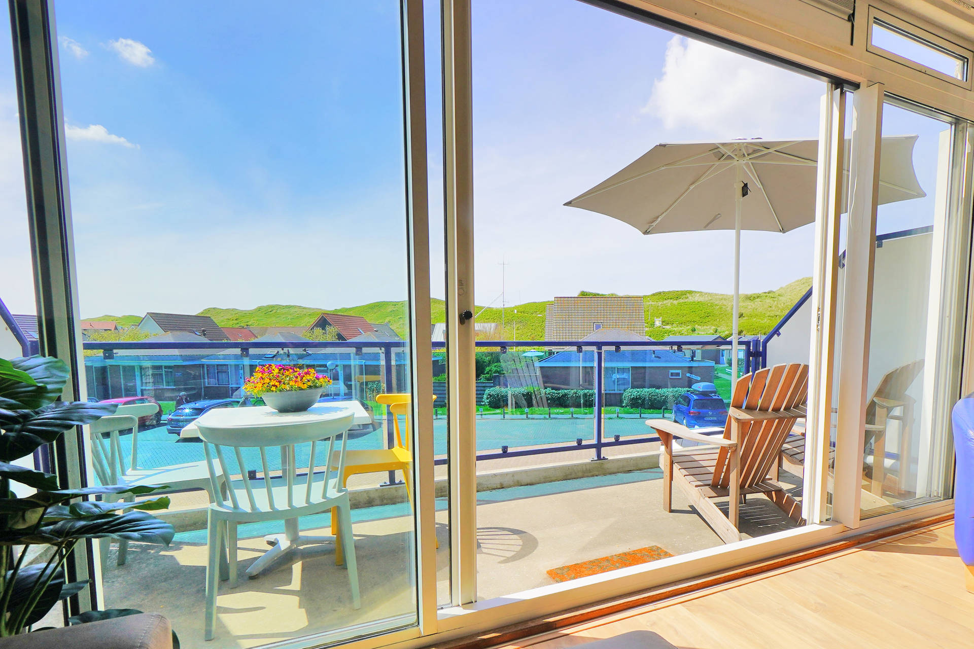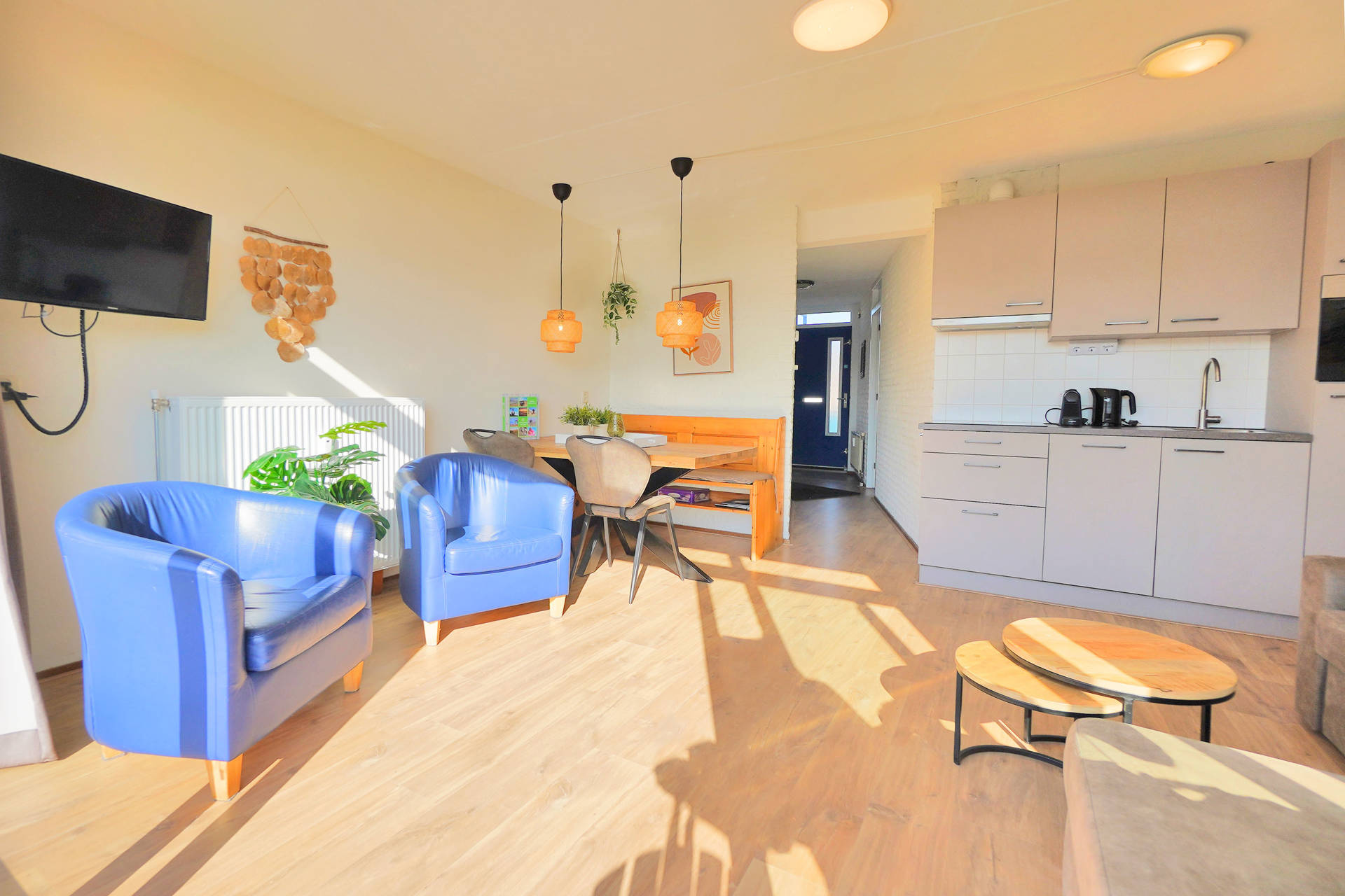 Das helle Wohnzimmer mit Flügeltüren zur Terrasse bietet eine wunderbare Aussicht auf die Dünen. Das Wohnzimmer hat eine offene Küche, einen Esstisch für vier Personen und eine TV-Sitzecke mit Stühlen und einem Sofa.