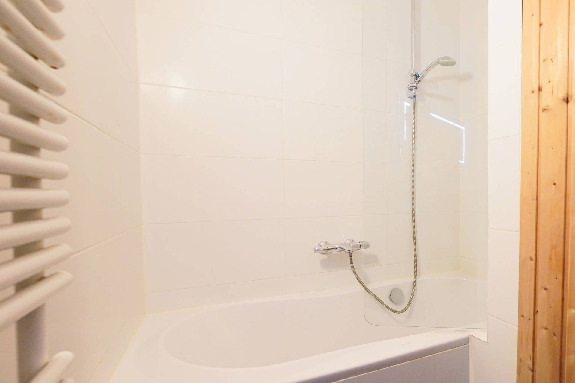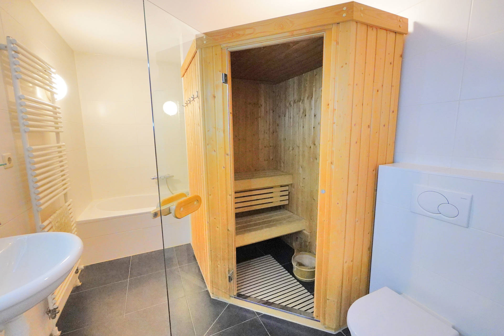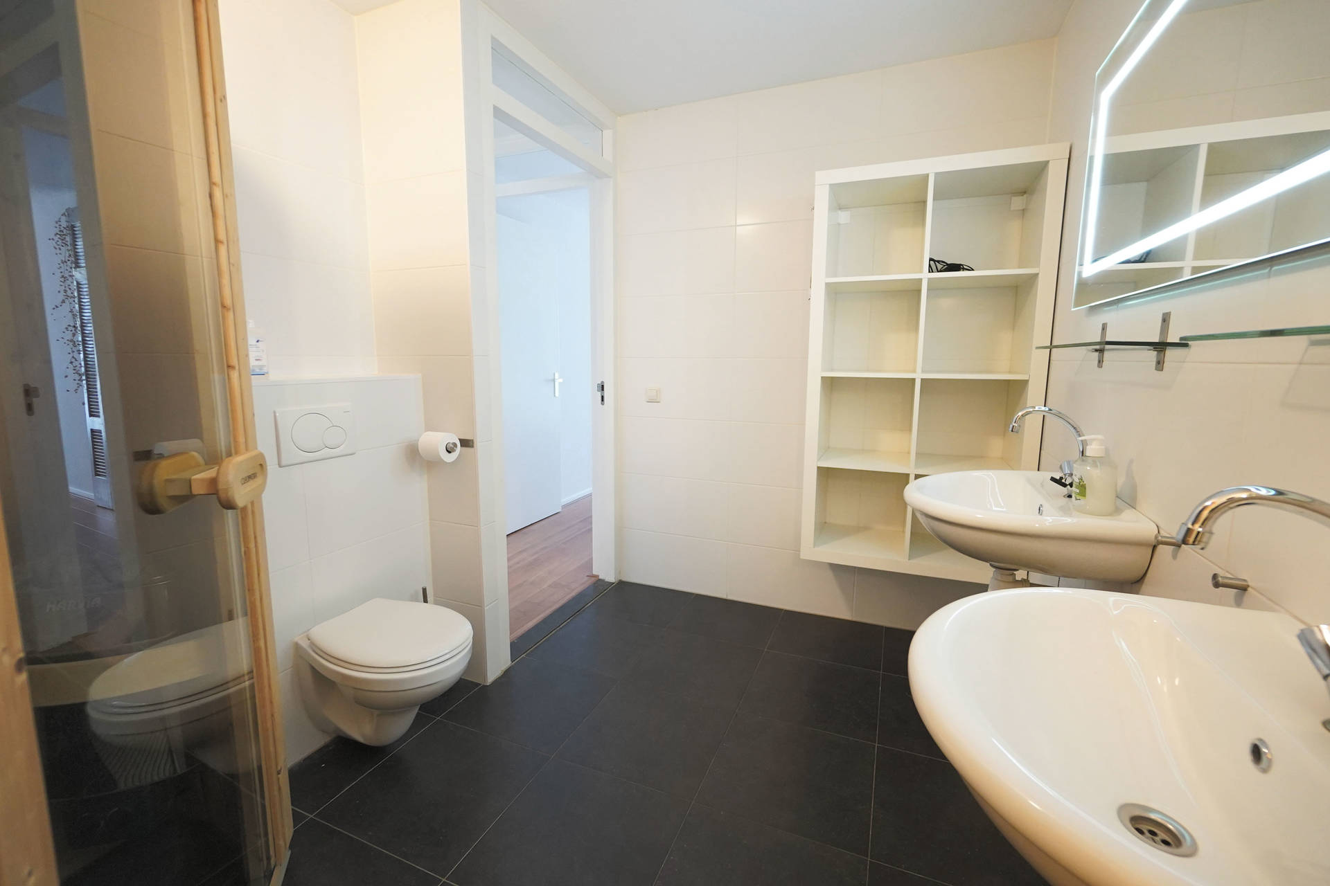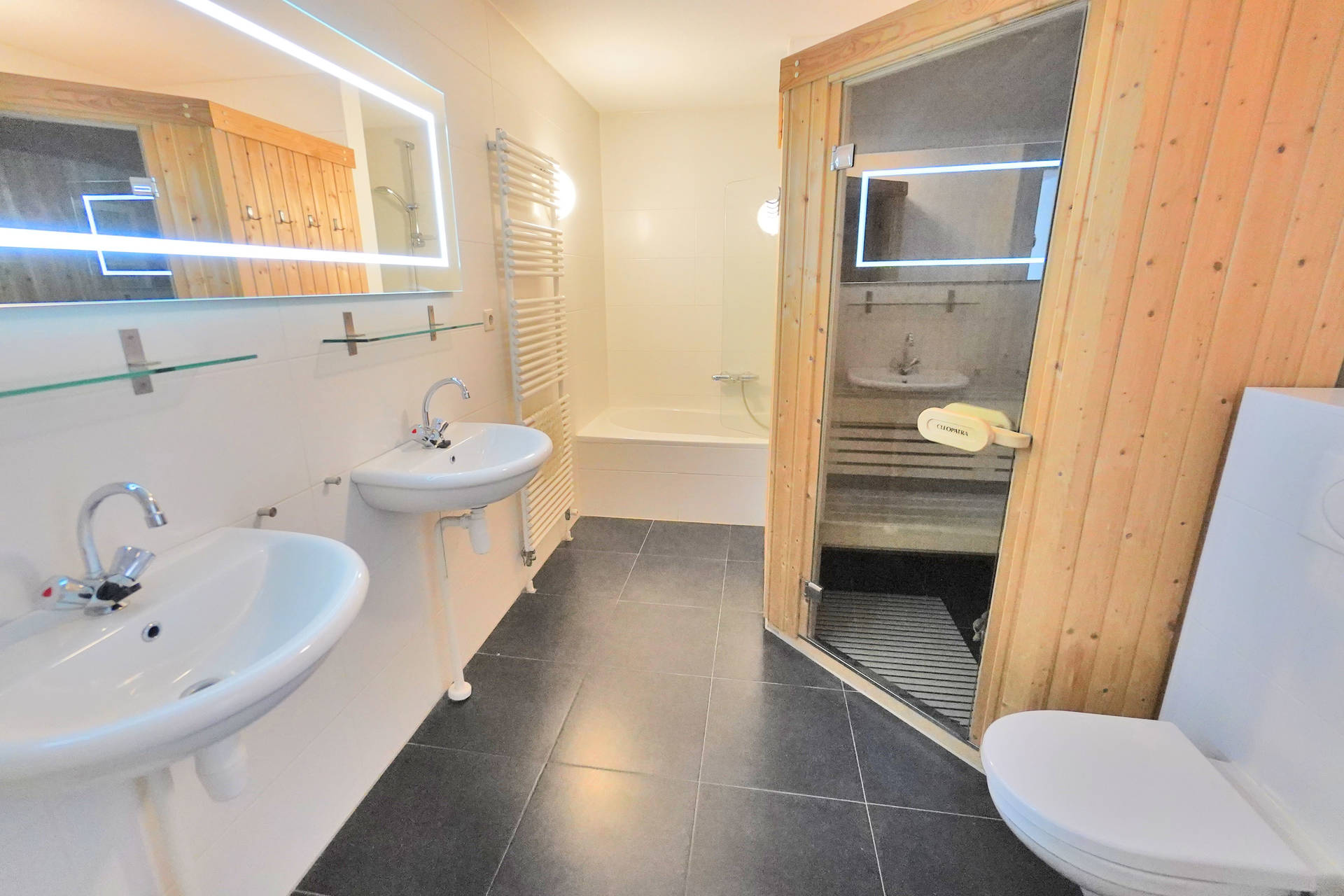 Das Bad hat eine Badewanne, separate Dusche, Toilette und zwei Waschbecken. Auch gibt es eine extra getrennte Toilette.